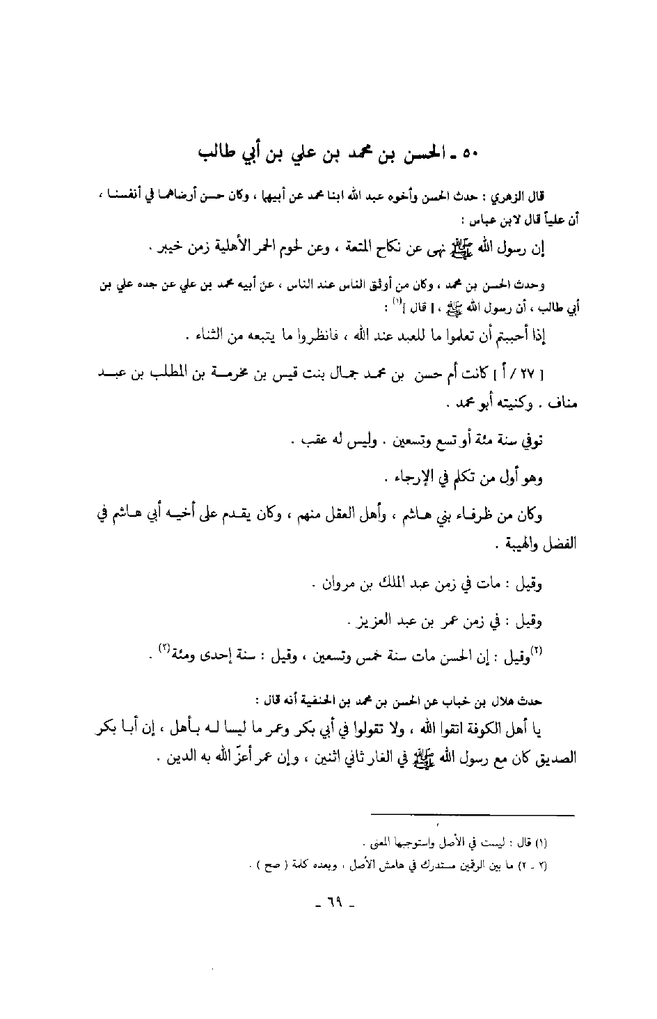 حدث هلال بن خباب عن الحسن بن محمد بن الحنفية أنه قال: يا أهل الكوفة اتقوا الله، ولا تقولوا في أبي بكر وعمر ما ليسا له بأهل، إن أبا بكر الصديق كان مع رسول الله صَلَّى اللهُ عَلَيْهِ وَسَلَّمَ في الغار ثاني اثنين، وإن عمر أعز الله بن الدين.