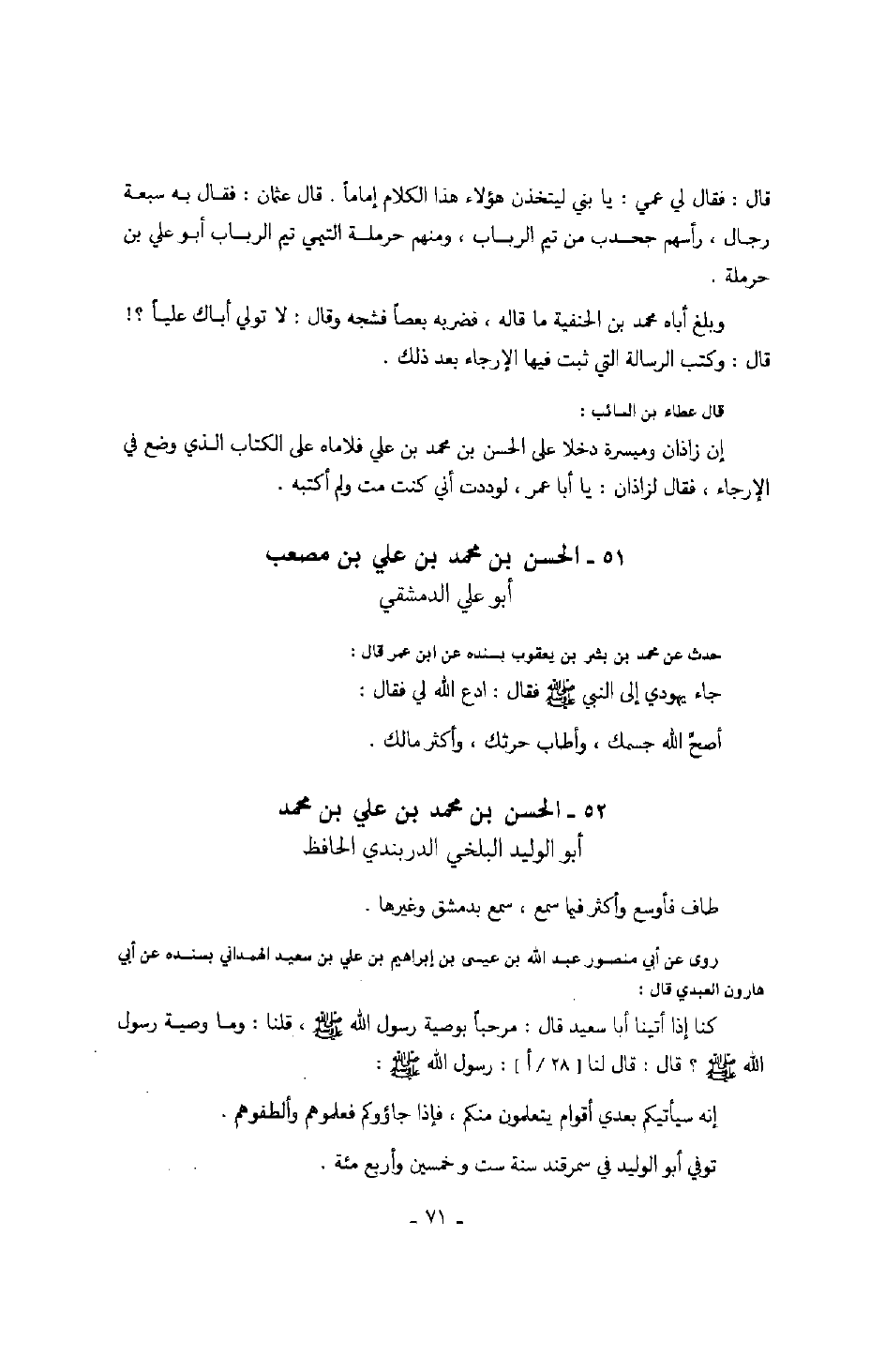قال: فقال لي عمي: يا بني ليتخذن هؤلاء هذا الكلام إماماً. قال عثمان: فقال به سبعة رجال، رأسهم جحدب من تيم الرباب، ومنهم حرملة التيمي تيم الرباب أبو علي بن حرملة.