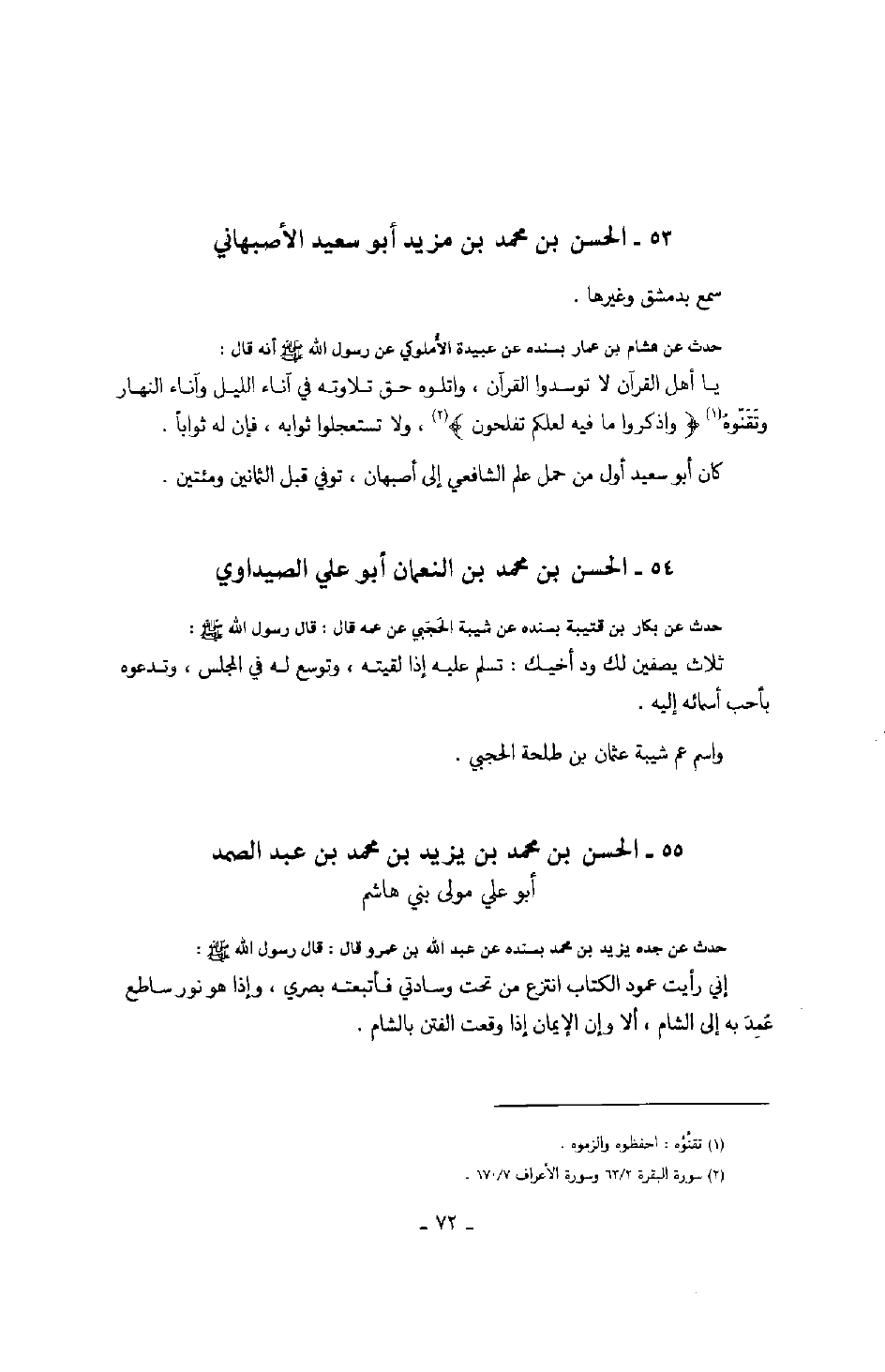 حدث عن هشام بن عمار بسنده عن عبيدة الأملوكي عن رسول اله صَلَّى اللهُ عَلَيْهِ وَسَلَّمَ أنه قال: يا أهل القرآن لا توسدوا القرآن، واتلوه حق تلاوته في آناء الليل وآناء النهار وتقنوه " واذكروا ما فيه لعلكم تفلحون ". ولا تستعجلوا ثوابه، فإن له ثواباً.