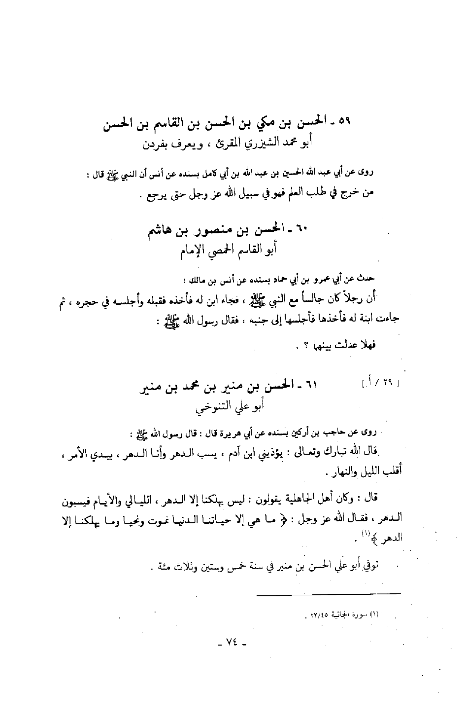 أبو علي التنوخي روى عن حاجب بن أركين بسنده عن أبي هريرة قال: قال رسول الله صَلَّى اللهُ عَلَيْهِ وَسَلَّمَ: قال الله تبارك وتعالى: يؤذيني ابن آدم، يسب الدهر وأنا الدهر، بيدي الأمر، أقلب الليل والنهار.