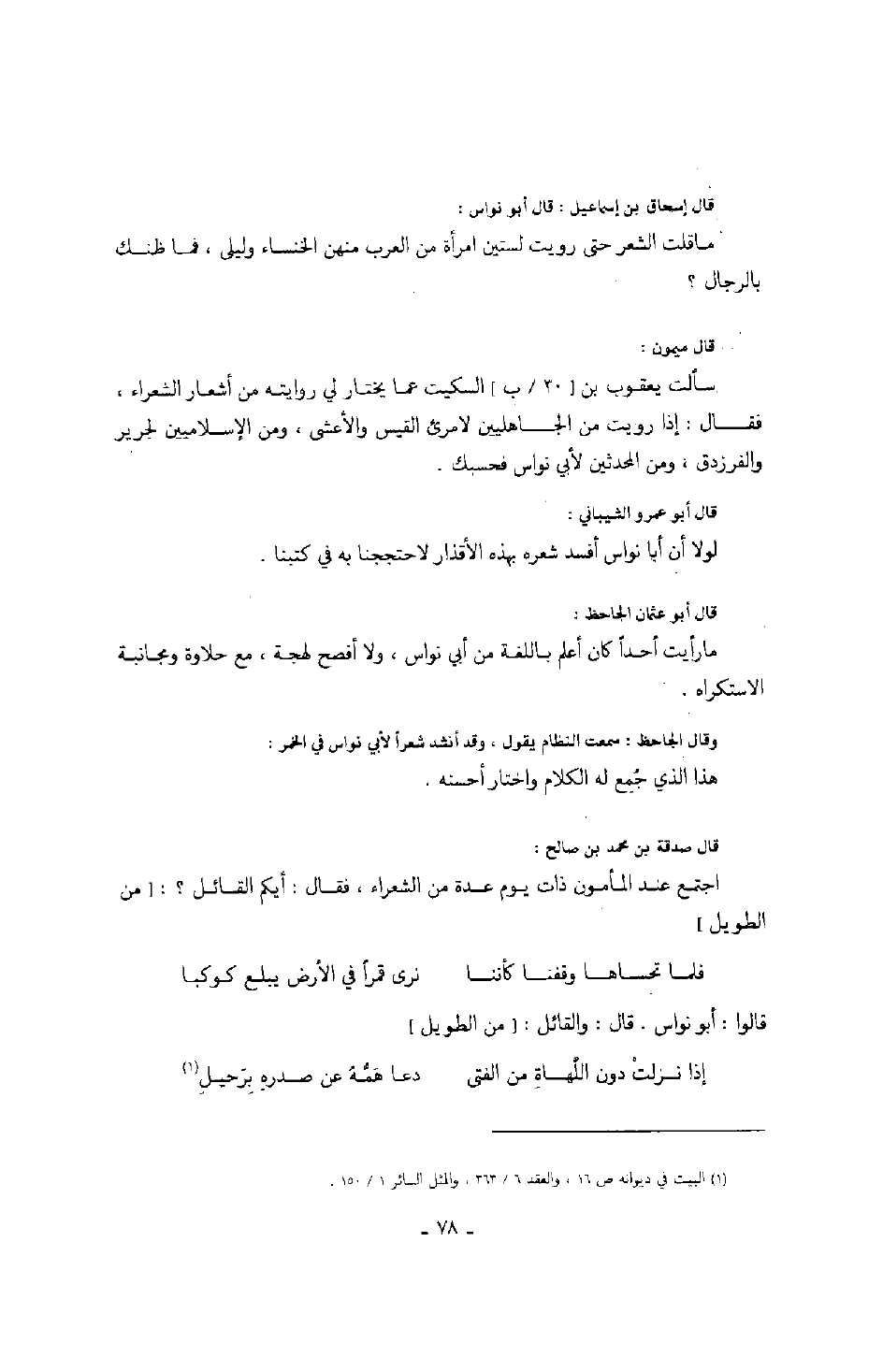 قال إسحاق بن إسماعيل: قال أبو نواس: ما قلت الشعر حتى رويت لستين امرأة من العرب منهن الخنساء وليلى، فما ظنك بالرجال؟ قال ميمون: سألت يعقوب بن السكيت عما يختار لي روايته من أشعار الشعراء، فقال: إذا رويت من الجاهلين لامرىء القيس والأعشى، ومن الإسلاميين لجرير والفرزدق، ومن المحدثين لأبي نواس فحسبك.