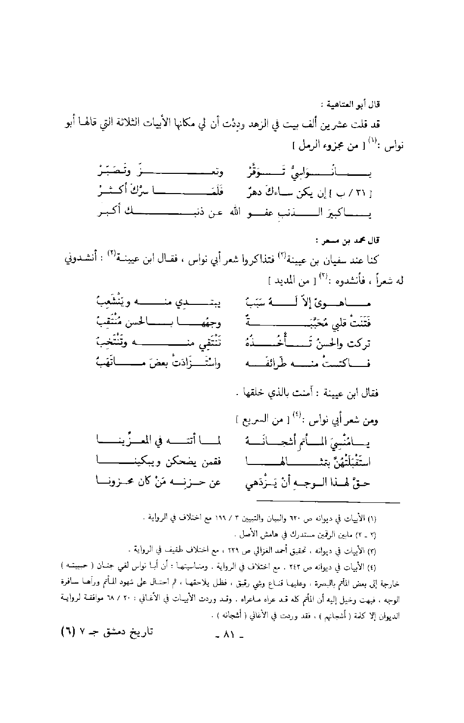 قال محمد بن مسعر: كنا عند سفيان بن عيينة فتذاكروا شعر أبي نواس، فقال ابن عيينة: أنشدوني له شعراً، فأنشدوه: من المديد