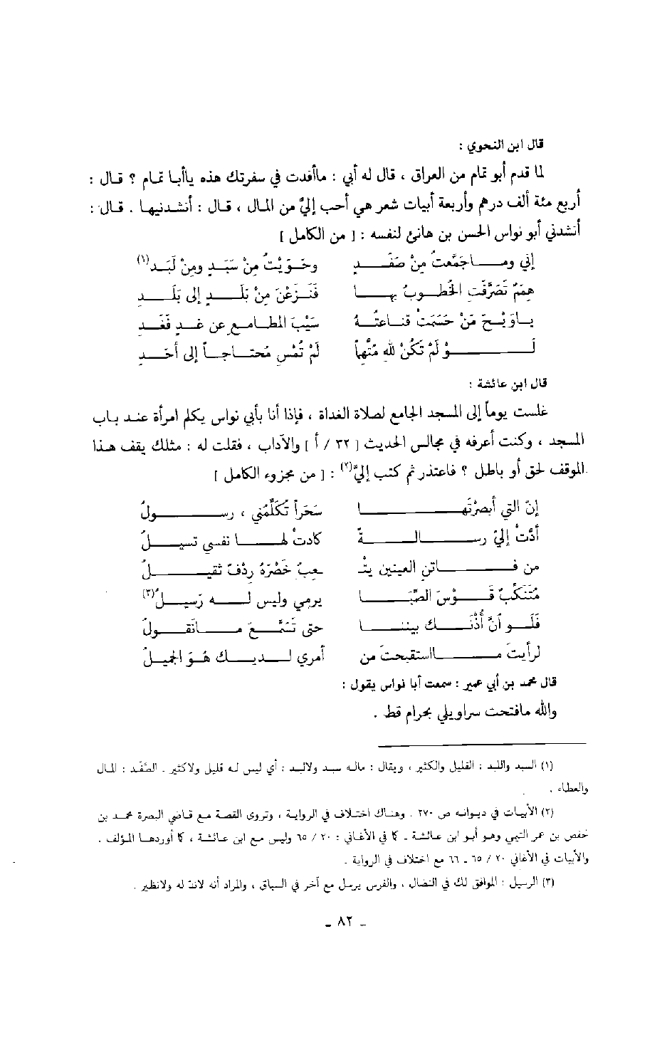 قال ابن النحوي: لما قدم أبو تمام من العراق، قال له أبي: ما أفدت في سفرتك هذه يا أبا تمام؟ قال: أربع مئة ألف درهم وأربعة أبيات شعر هي أحب إلي من المال، قال: أنشدنيها. قال: أنشدني أبو نواس الحسن بن هانىء لنفسه: من الكامل