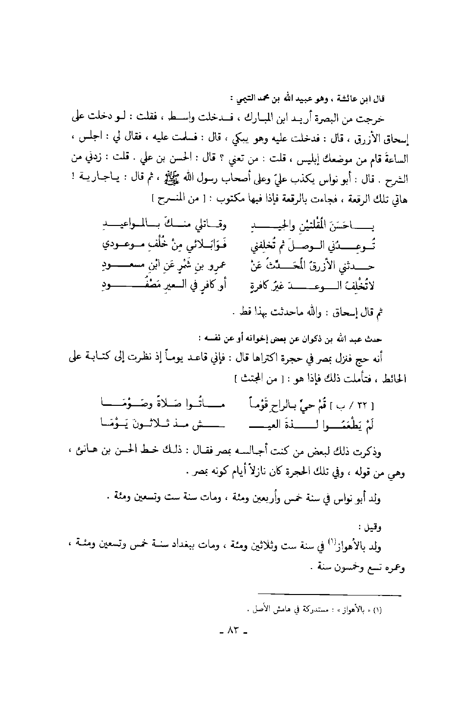 قال ابن عائشة، وهو عبيد الله بن محمد التيمي: خرجت من البصرة أريد ابن المبارك، فدخلت واسط، فقلت، لو دخلت على إسحاق الأزرق، قال: فدخلت عليه وهو يبكي، قال: فسلمت عليه، فقال لي: اجلس، الساعة قام من موضعك إبليس، قلت: من تعني؟ قال: الحسن بن علي. قلت: زدني من الشرح. قال: أبو نواس يكذب علي وعلى أصحاب رسول الله صَلَّى اللهُ عَلَيْهِ وَسَلَّمَ، ثم قال: يا جارية! هاتي تلك الرقعة، فجاءت فإذا فيها مكتوب: من المنسرح