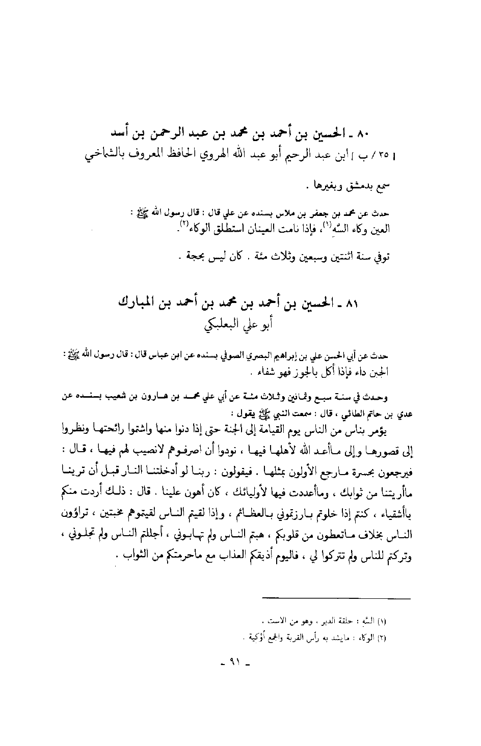 وحدث في سنة سبع وثمانين وثلاث مئة عن أبي علي محمد بن هارون بن شعيب بسنده عن عدي بن حاتم الطائي، قال: سمعت النبي صَلَّى اللهُ عَلَيْهِ وَسَلَّمَ يقول: يؤمر بناس من الناس يوم القيامة إلى الجنة حتى إذا دنوا منها واشتموا رائحتها ونظروا إلى قصورها وإلى ما أعد الله لأهلها فيها، نودوا أن أصرفوهم لا نصيب لهم فيها، قال: فيرجعون بحسرة ما رجع الأولون بمثلها. فيقولون: ربنا لو أدخلتنا النار قبل أن ترينا ما أريتنا من ثوابك، وما أعددت فيها لأوليائك، كان أهو علينا. قال: ذلك أردت منكم يا أشقياء، كنتم إذا خلوتم بارزتموني بالعظائم، وإذا لقيتم الناس لقيتموهم مخبتين، تراؤون الناس بخلاف ما تعطون من قلوبكم، هبتم الناس ولم تهابوني، أجللتم الناس ولم تجلوني، وتركتم للناس ولم تتركول لي، فاليوم أذيقكم العذاب مع ما حرمتكم من الثواب.