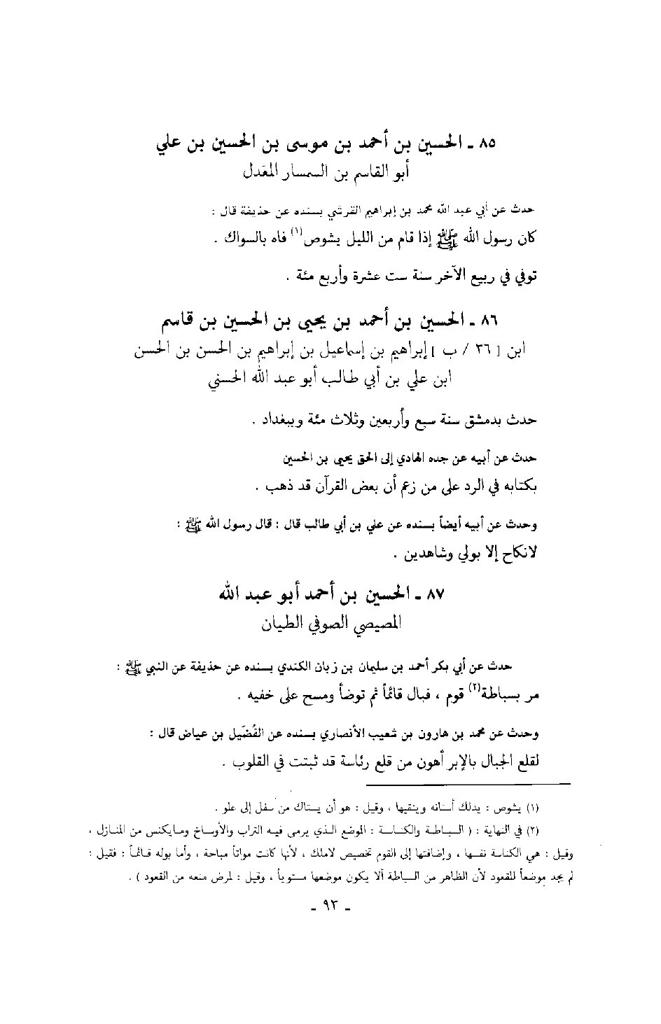 ابن الحسين بن علي أبو القاسم بن السمسار المعدل حدث عن أبي عبد الله محمد بن إبراهيم القرشي بسنده عن حذيفة قال: كان رسول الله صَلَّى اللهُ عَلَيْهِ وَسَلَّمَ إذا قام من الليل يشوص فاه بالسواك.