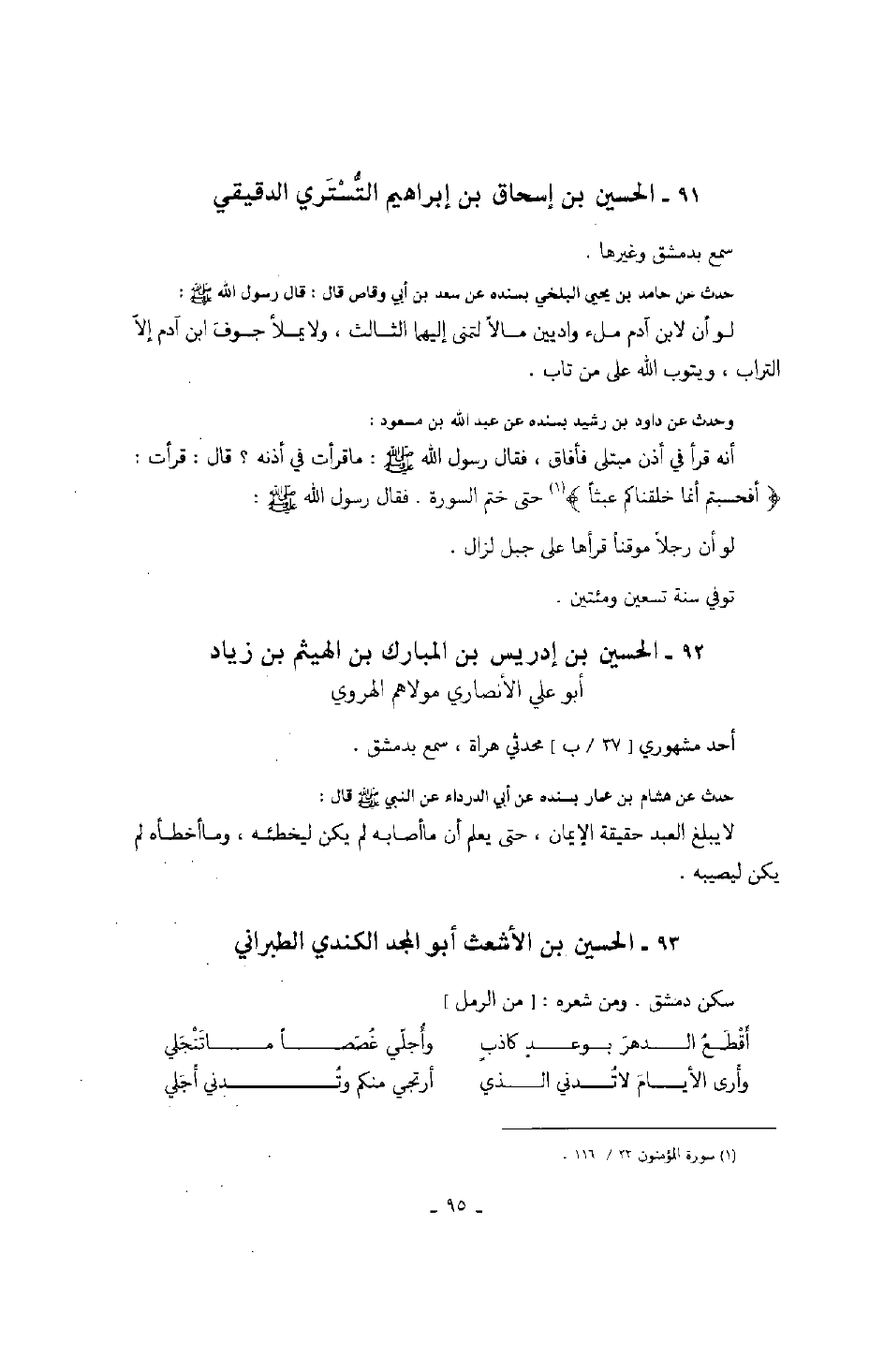وحدث عن داود بن رشيد بسنده عن عبد الله بن مسعود: أنه قرأ في أذن مبتلى فأفاق، فقال رسول الله صَلَّى اللهُ عَلَيْهِ وَسَلَّمَ: ما قرأت في أذنه؟ قال: قرأت " أفحسبتم أنما خلقناكم عبثاً " حتى ختم السورة. فقال رسول الله صَلَّى اللهُ عَلَيْهِ وَسَلَّمَ: لو أن رجلاً موقناً قرأها على جبل لزال.