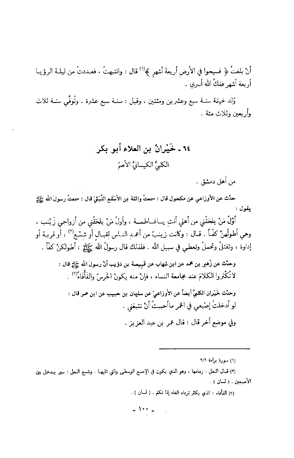 وحدث خيران الكلبي أيضاً عن الأوزاعي عن سليمان بن حبيب عن ابن عمر قال: لو أدخلت إصبعي في الخمر ما أحببت أن تتبعني.