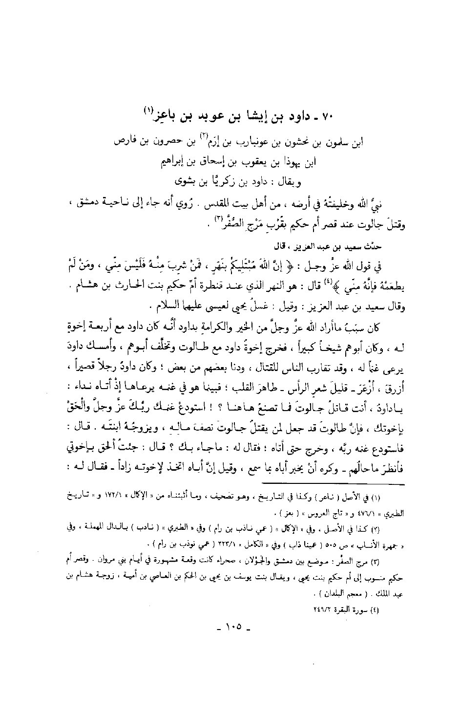 ابن سلمون بن نحشون بن عونبارب بن إرم بن حصرون بن فارص بن يهوذا بن يعقوب بن إسحاق بن إبراهيم ويقال: داود بن زكريا بن بشوى نبي الله وخليفته في أرضه، من أهل بيت المقدس. روي أنه جاء إلى ناحية دمشق، وقتل جالوت عند قصر أم حكيم بقرب مرج الصفر.
