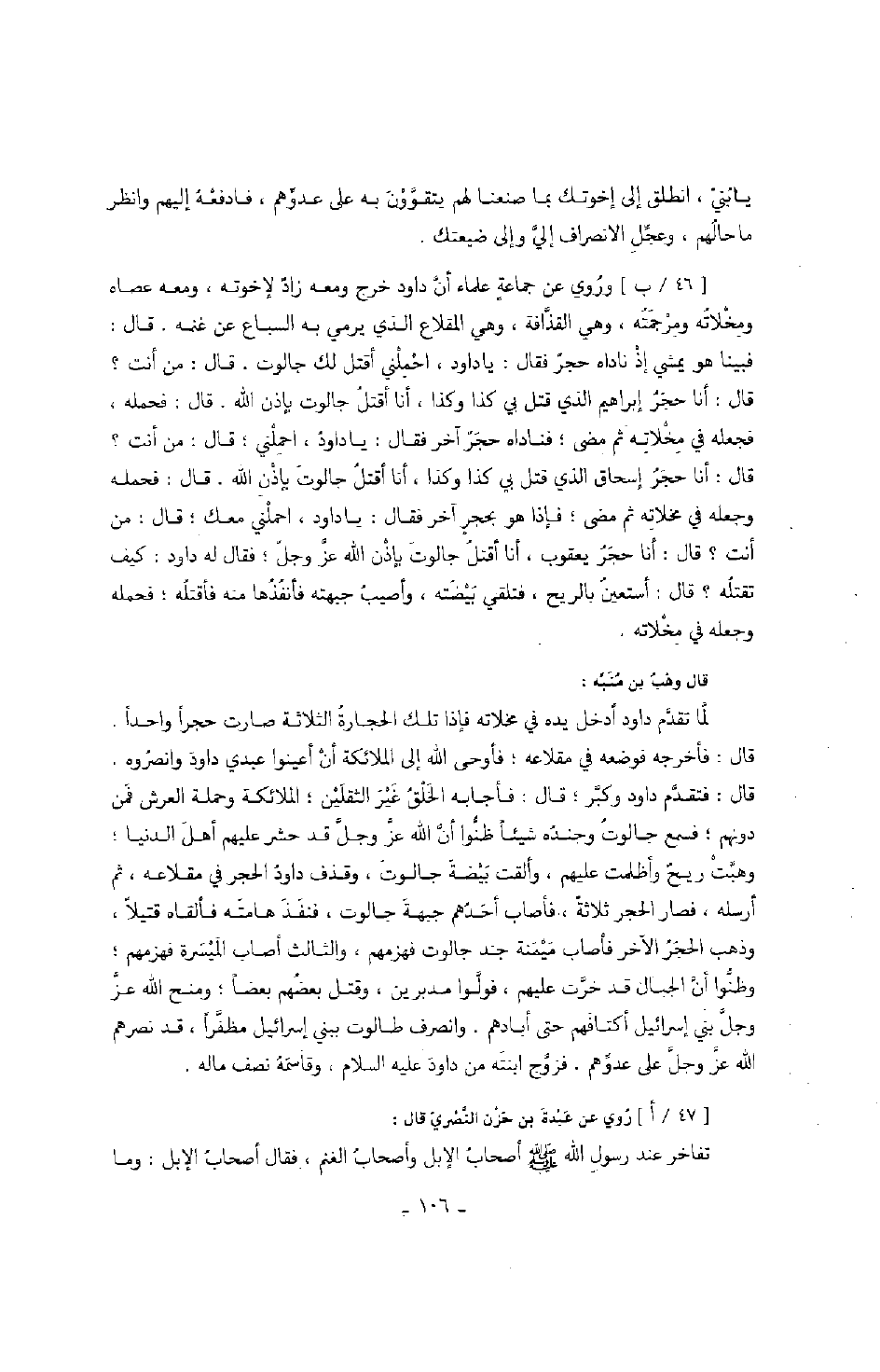 وروي عن جماعة علماء أن داود خرج ومعه زاد لإخوته، ومعه عصاه ومخلاته ومرجمته، وهي القذافة، وهي المقلاع الذي يرمي به السباع عن غنمه. قال: فبينا هو يمشي إذ ناداه حجر فقال: يا داود، احملني أقتل لك جالوت. قال: من أنت؟ قال: أنا حجر إبراهيم الذي قتل بي كذا وكذا، أنا أقتل جالوت بإذن الله. قال: فحمله، فجعله في مخلاته ثم مضى؛ فناداه حجر آخر فقال: يا داود، احملني؛ قال: من أنت؟ قال: أنا حجر إسحاق الذي قتل بي كذا وكذا، أنا أقتل جالوت بإذن الله. قال: فحمله وجعله في مخلاته ثم مضى؛ فإذا هو بحجر آخر فقال: يا داود، احملني معك؛ قال: من أنت؟ قال: أنا حجر يعقوب، أنا أقتل جالوت بإذن الله عز وجل؛ فقال له داود: كيف تقتله؟ قال: أستعين بالريح، فتلقي بيضته، وأصيب جبهته فأنفذها منه فأقتله؛ فحمله وجهله في مخلاته.
