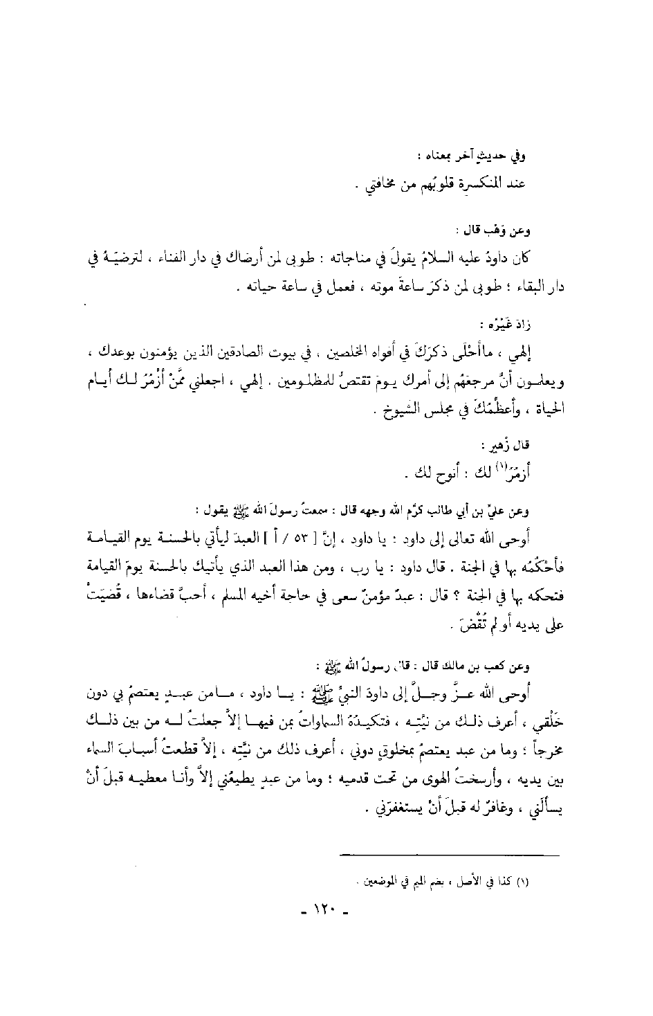 زاد غيره: إلهي، ما أحلى ذكرك في أفواه المخلصين، في بيوت الصادقين الذين يؤمنون بوعدك، ويعلمون أن مرجعهم إلى أمرك يوم تقتص للمظلومين. إلهي، اجعلني ممن أزمر لك أيام الحياة، وأعظمك في مجلس الشيوخ.