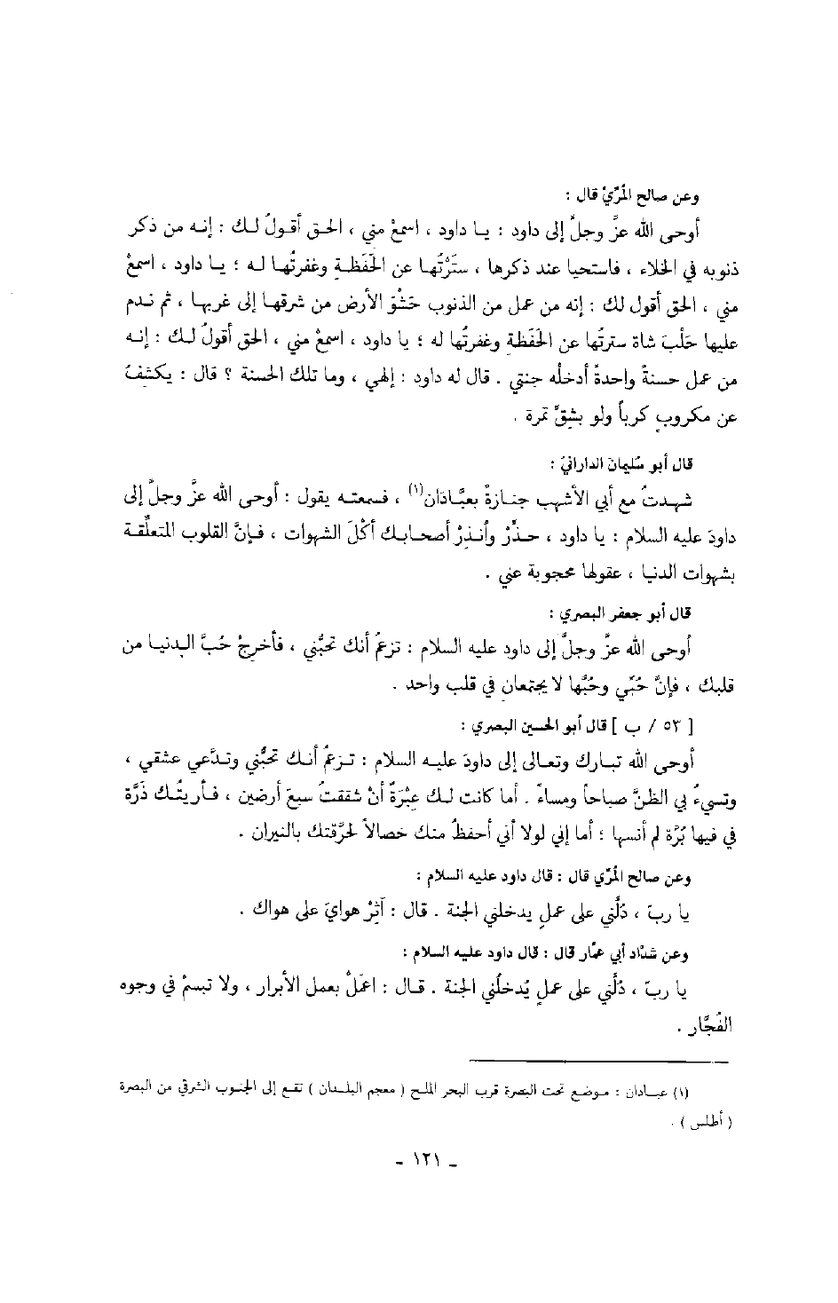 قال أبو الحسين البصري: أوحى الله تبارك وتعالى إلى داود عليه السلام: تزعم أنك تحبني وتدعي عشقي، وتسيء بي الظن صباحاً ومساءً. أما كانت لك عبرة أن شققت سبع أرضين، فأريتك ذرة في فيها برة لم أنسها؛ أما إني لولا أني أحفظ منك خصالاً لحرقتك بالنيران.