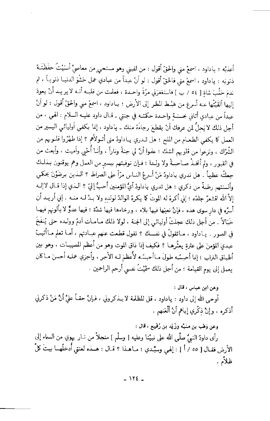 أعذبه؛ يا داود، اسمع مني والحق أقول: من لقيني وهو مستحي من معاصي أنسيت حفظته ذنوبه؛ يا داود، اسمع مني والحق أقول: لو أن عبداً من عبادي عمل حشو الدنيا ذنوباً، ثم ندم حلب شاة فاستغفرني مرةً واحدةً، فعلمت من قلبه أنه لا يريد أن يعود إليها ألقيتها عنه أسرع من هبط المطر إلى الأرض؛ يا داود، اسمع مني والحق أقول: لو أن عبداً من عبادي أتاني بحسنة واحدة حكمته في جنتي قال داود عليه السلام: إلهي، من أجل ذلك لا يحل لمن عرفك أن يقطع رجاءه منك يا داود، إنما يكفي أوليائي اليسير من العمل كما يكفي الطعام من الملح؛ هل تدري يا داود متى أتولاهم؟ إذا طهروا قلوبهم من الشرك، ونزعوا من قلوبهم الشك؛ علموا أن لي جنةً وناراً، وأنا أحيي وأميت، وأبعث من في القبور، ولم أتخذ صاحبةً ولا ولدا؛ فإن توفيتهم بيسير من العمل وهو يوقنون بذلك جعلته عظيماً. هل تدري يا داود من أسرع الناس مراً على الصراط؟ الذين يرضون بحكمي وألسنتهم رطبةً من ذكري؛ هل تدري يا داود أي المؤمنين أحب إلي؟ الذي إذا قال لا إله إلا الله اقشعر جلده؛ إني أكره له الموت كما يكره الوالد لولده ولا بد له منه. أني أريد أن أسره في دار سوى هذه، فإن نعيمها فيها بلاء، ورخاءها فيها شدة؛ فيها عدو لا يألونهم فيها خبالاً. من أجل ذلك عجلت أوليائي إلى الجنة، لولا ذلم ما مات آدم وولده حتى ينفخ في الصور. يا داود، ما تقول في نفسك؟ تقول قطعت عنهم عبادتهم، أما تعلم ما أثيب عبدي المؤمن على عثرة يعثرها؟ فكيف إذا ذاق الموت وهو من اعظم المصيبات، وهو بين أطباق التراب؛ إنما أحبسه طول ما أحبسه لأعظم له الأجر، وأجزي عمله أحسن ما كان يعمل إلى يوم القيامة؛ من أجل ذلك سميت نفسي أرحم الراحمين.