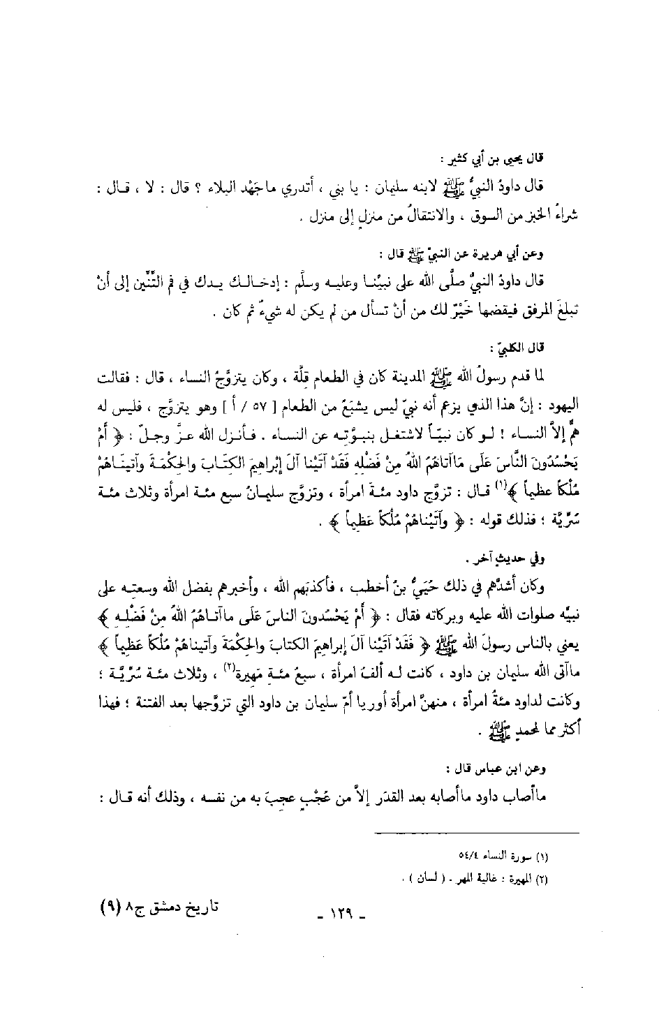 قال الكلبي: لما قدم رسول الله صَلَّى اللهُ عَلَيْهِ وَسَلَّمَ المدينة كان في الطعام قلة، وكان يتزوج النساء، قال: فقالت اليهود: إن هذا الذي يزعم أنه نبي ليس يشبع من الطعام وهو يتزوج، فليس له هم إلا النساء! لو كان نبياً لاشتغل بنبوته عن النساء. فأنزل الله عز وجل: " أم يحسدون الناس على ما آتاهم الله من فضله فقد آتينا آل إبراهيم الكتاب والحكمة وآتيناهم ملكاً عظيماً " قال: تزوج داود مئة امرأة، وتزوج سليمان سبع مئة امرأة وثلاث مئة سرية؛ فذلك قوله: " وآتيناهم ملكاً عظيماً ".