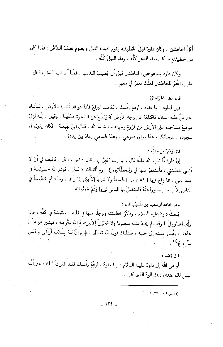 أكل الخاطئين. وكان داود قبل الخطيئة يقوم نصف الليل ويصوم نصف الدهر؛ فلما كان من خطيئته ما كان صام الدهر كله، وقام الليل كله.