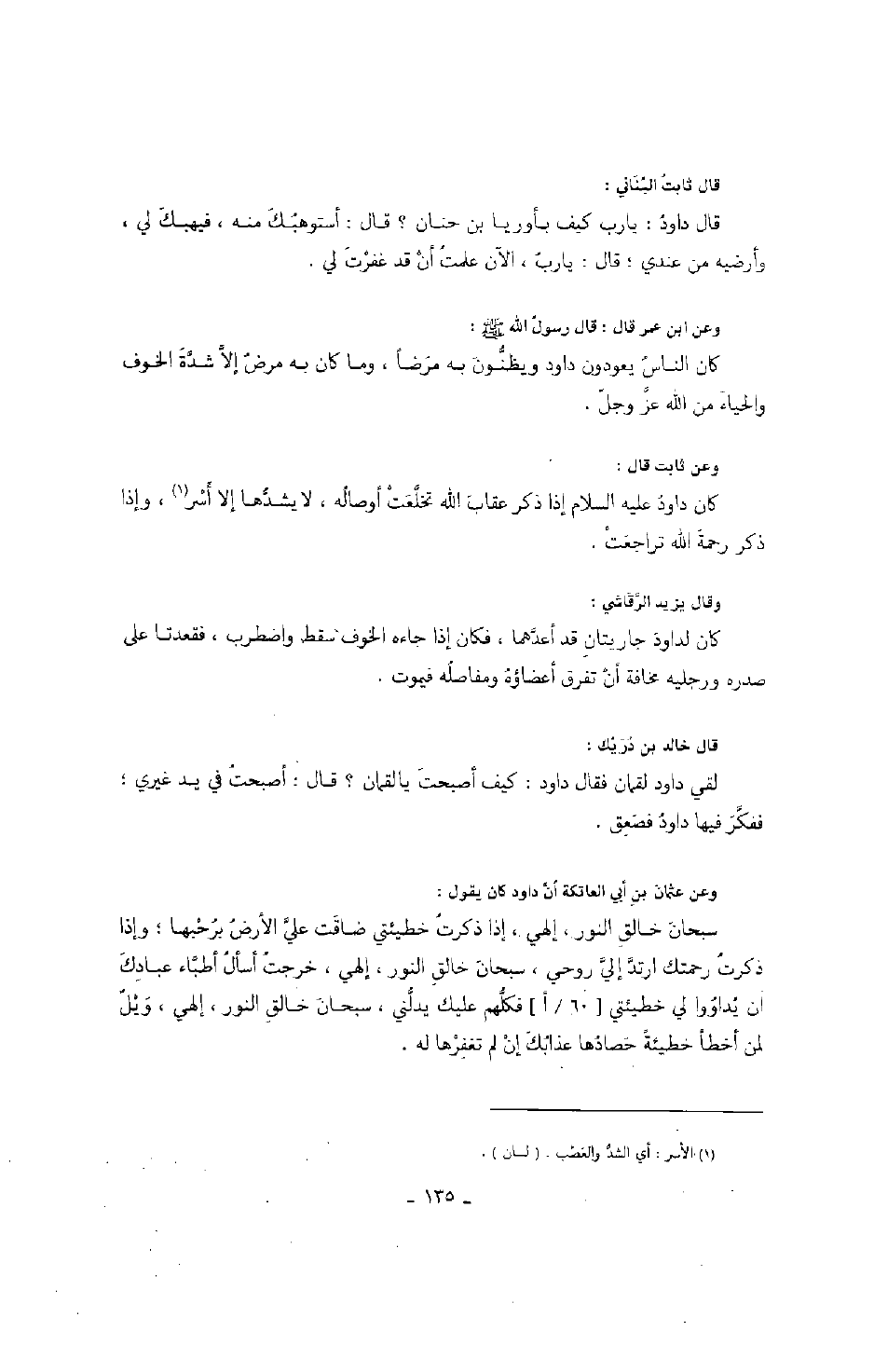وعن عثمان بن أبي العاتكة أن داود كان يقول: سبحان خالق النور، إلهي، إذا ذكرت خطيئتي ضاقت علي الأرض برحبها؛ واذا ذكرت رحمتك ارتد إلي روحي، سبحان خالق النور، إلهي، خرجت أسأل أطباء عبادتك أن يداؤوا لي خطيئتي فكلهم عليك يدلني، سبحان خالق النور، إلهي ويل لم أخطأ خطيئة حصادها عذابك إن لم تغفرها له.