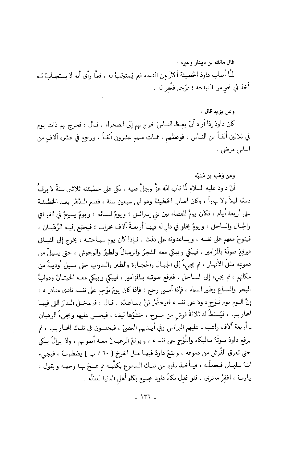 وعن وهب بن منبه أن داود عليه السلام لما تاب الله عز وجلعليه، بكى على خطيئته ثلاثين سنة لايرقأ دمعه ليلاً ولا نهاراً، وكان أصاب الخطيئة وهو ابن سبعين سنة، فقسم الدهر بعد الخطيئة على أربعة أيام: فكان يوم للقضاء بين بني إسرائيل؛ ويوم لنسائه؛ ويوم يسيح في الفيافي والجبال الساحل؛ ويوم يخلو في دار له فيها أربعة آلاف محراب؛ فيجتمع إليه الرهبان، فينوح معهم على نفسه، ويساعدونه على ذلك. فإذا كان يوم سياحته، يخرج إلى الفيافي فيرفع صوته بالمزامير، فيبكي ويبكي معه الشجر والرمال والطير والوحوش، حتى يسيل من دموعه منل الأنهار، ثم يجيء إلى الجبال والحجارة والطير والدواب حتى يسيل أودية من مكانهم، ثم يجيء إلى الساحل، فيرفع صوته بالمزامير، فيبكي ويبكي معه الحيتان ودواب البحر والسباع وطير السماء، فإذا أمسى رجع؛ فإذا كان يوم نوحه على نفسه نادى مناديه: إن اليوم يوم نوح داود على نفسه فليحضر من يساعده. قال: فيدخل الدار التي فيها المحاريب، فيبسط له ثلاثة فرش من مسوح، حشوها ليف، فيجلس عليها ويجيء الرهبان أربعة آلاف راهب عليهم البرانس وفي أيديهم العصي، فيجلسون في تلك المحاريب، ثم يرفع داود صوته بالبكاء والنوح على نفسه، ويرفع الرهبان معه أصواتهم، ولا يزال يبكي حتى تغرق الفرش من دموعه، ويقع داود فيها مثل الفرخ يضطرب، فيجيء ابنه سليمان فيحمله، فيأخذ داود من تلك الدموع بكفيه ثم يمسح بها وجهه ويقول: يارب اغفر ماترى. فلو عدل بكاء داود بجميع بكاء أهل الدنيا لعدله.