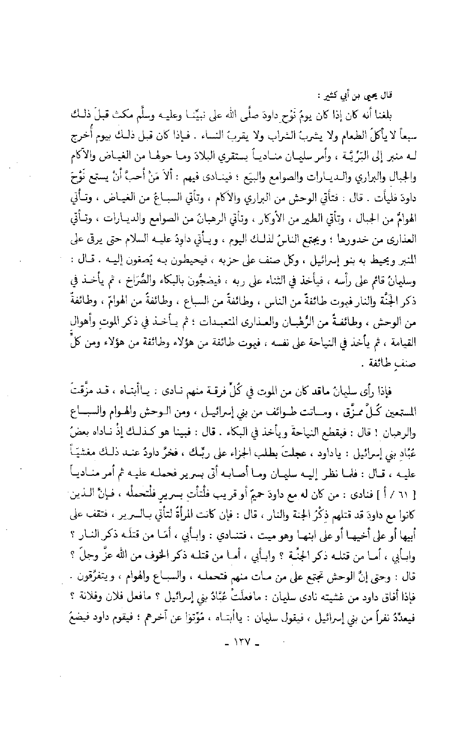 فاذا رأى سليمان ماقد كان من الموت في كل فرقة منهم نادى: يا أبتاه، قد مزقت المستمعين كل ممزق، وماتت طوائف من بني إسرائيل، ومن الوحوش والهوام والسباع والرهبان! قال: فيقطع النياحة ويأخذ في البكاء. قال: فبينا هو كذلك إذ ناداه بعض عباد بني إسرائيل: ياداود، عجلت بطلب الجزاء على ربك، فخر داود عند ذلك مغشياً عليه، قال: فلما نظر إليه سليمان وما أصابه أتى بسرير فحمله عليه ثم أمر منادياً فنادى: من كان له مع داود حميم أو قريب فلتأت بسرير فلتحمله، فإن الذين كانوا مع داود قد قتلهم ذكر الجنة والنار، قال: فإن كانت المرأة لتأتي بالسرير، فتقف على أبيها أو على أخيها أو على ابنها وهو ميت، فتنادي: وابأبي، أما من قتله ذكر النار؟ وابأبي، أما من قتله ذكر الجنة؟ وابأبي، أما من قتله ذكر الخوف من الله عز وجل؟ قال: وحتى إن الوحش تجتمع على من مات منهم فتحمله، والسباع والهوام، ويتفرقون. فإذا أفاق داود من غشيته نادى سليمان: مافعلت عباد بني إسرائيل؟ مافعل فلان وفلانة؟ فيعدد نفراً من بني إسرائيل، فيقول سليمان: يا أبتاه، موتوا عن آخرهم؛ فيقوم داود فيضع