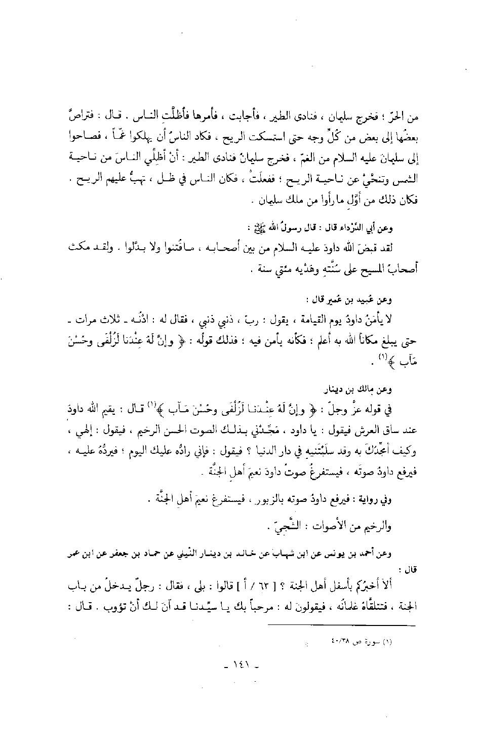 وعن مالك بن دينار في قوله عز وجل " وإن له عندنا لزلفى وحسن مآب " قال: يقيم الله داود عند ساق العرش فيقول: يا داود، مجدني بذلك الصوت الحسن الرخيم، فيقول: إلهي، وكيف أمجدك به وقد سلبتنيه في دار الدنيا؟ فيقول: فإني راده عليكاليوم؛ فيرده عليه، فيرفع داود صوته، فيستفرغ صوت داود نعيم أهل الجنة.