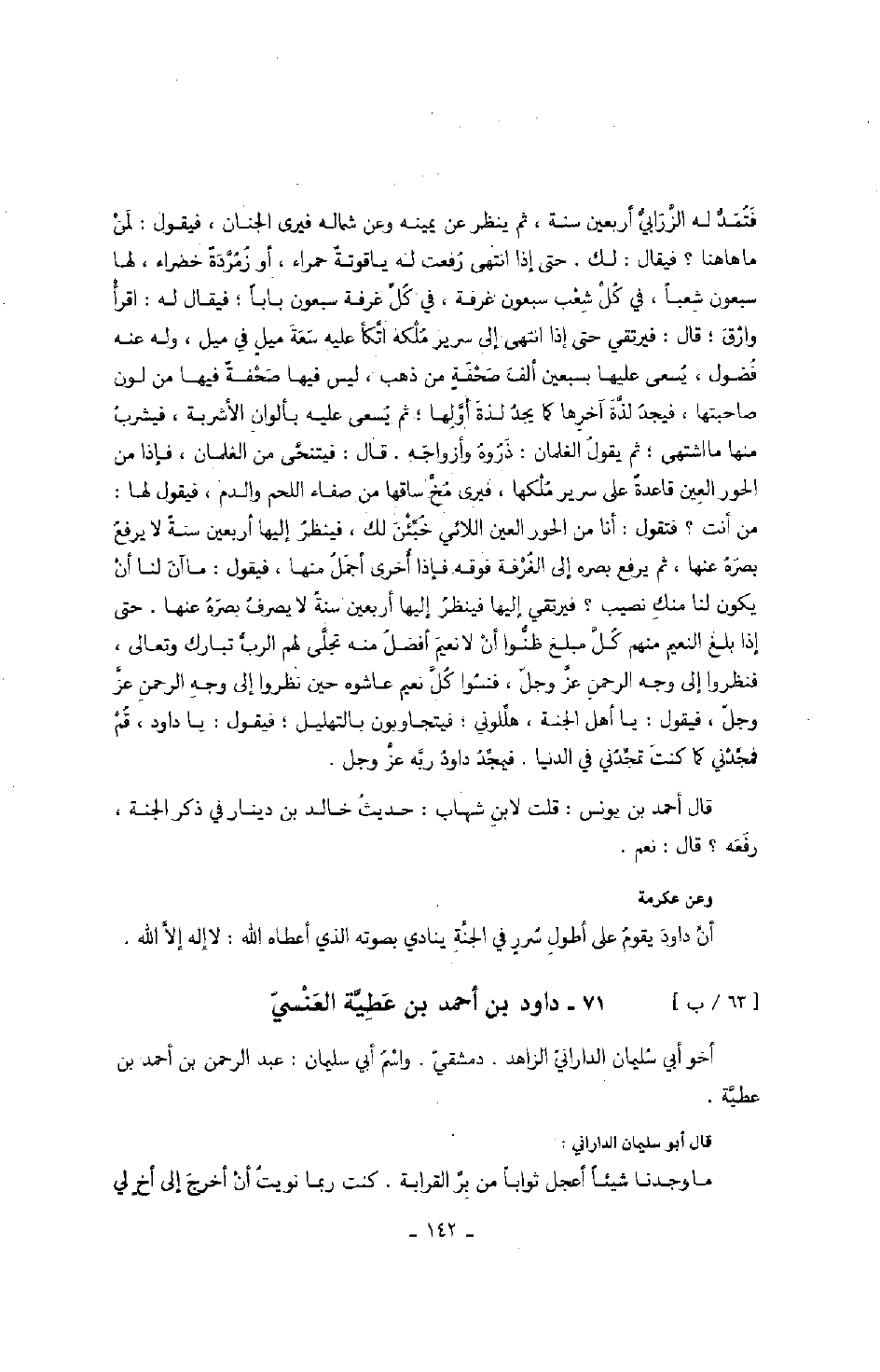 فتمد له الزرابي أربعين سنة، ثم ينظر عن يمينه وعن شماله فيرى الجنان، فيقول: لمن ما هاهنا؟ فيقال: لك. حتى إذا انتهى رفعت له ياقوتة حمراء، أو زمردة خضراء، لها سبعون شعباً، في كل شعب سبعون غرفة، في كل غرفة سبعون باباً؛ فيقال له: اقرأ وارق؛ قال: فيرتقي حتى إذا انتهى إلى سرير ملكه اتكأ عليه سعة ميل في يمل، وله عنه فضول، يسعى عليها بسبعين ألف صحفة من ذهب، ليس ليس فيها صحفة فيها من لون صاحبتها، فيجد لذة آخرها كما يجد لذة أولها؛ ثم يسعى عليه بألوان الأشربة، فيشرب منها ما اشتهى؛ ثم يقول الغلمان: ذروه وأزواجه. قال: فيتنحى من الغلمان، فإذا من الحور العين قاعدة على سرير ملكها، فيرى مخ ساقها من صفاء اللحم والدم، فيقول لها: من أنت؟ فتقول: أنا من الحور العين اللائي خبئن لك، فينظر إليها أربعين سنةً لا يرفع بصره عنها، ثم يرفع بصره إلى الغرفة فوقه فإذا أخرى أجمل منها، فيقول: ما آن لنا أن يكون لنا منك نصيب؟ فيرتقي إليها فينظر إليها أربعين سنةً لا يصرف بصره عنها. حتى إذا بلغ النعيم منهم كل مبلغ ظنوا أن لا نعين أفضل منه تجلى لهم الرب تبارك وتعالى، فنظروا إلى وجه الرحمن عز وجل، فنسوا كل نعيم عاشوه حين نظروا إلى وجه الرحمن عز وجل، فيقول: يا أهل الجنة، هللوني؛ فيتجاوبون بالتهليل؛ فيقول: يا داود، قم فمجدني كما كنت تمجدني في الدنيا. فيمجد داود ربه عز وجل.