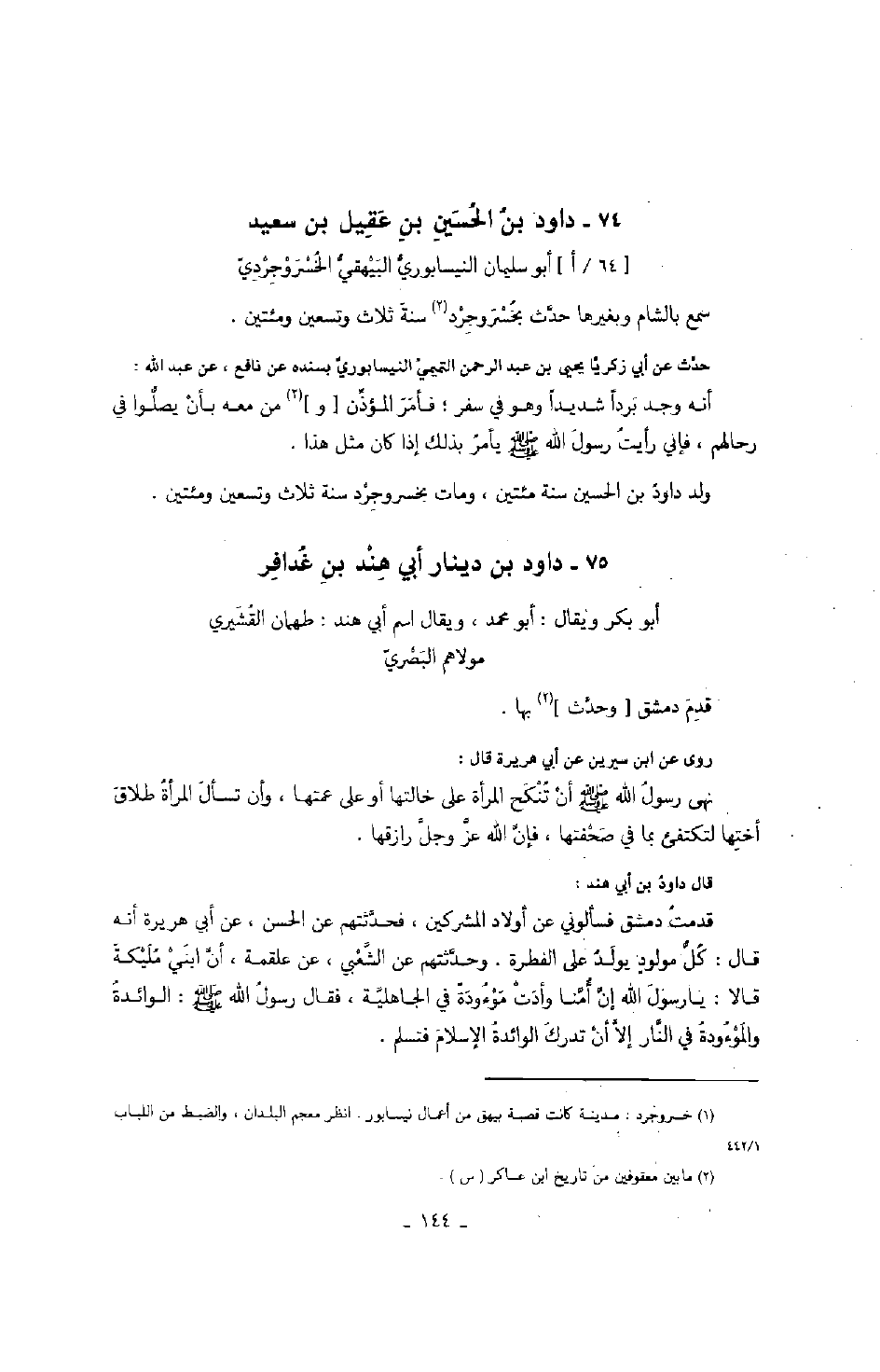 ولد داود بن الحسين سنة مئتين، ومات بخسروجرد سنة ثلاث وتسعين ومئتين.