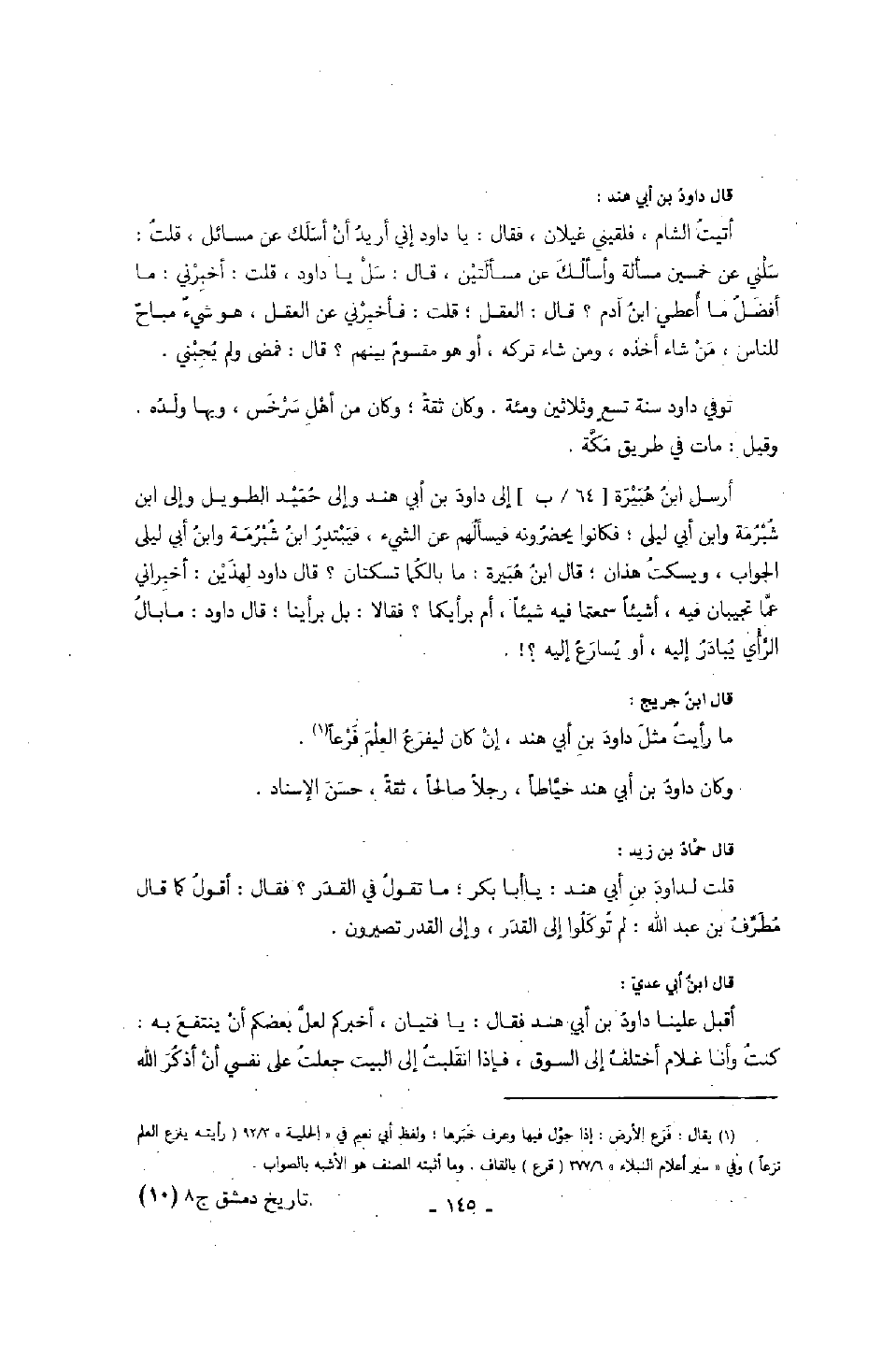 أرسل ابن هبيرة إلى داود بن أبي هند وإلى حميد الطويل وإلى ابن شبرمة وابن أبي ليلى؛ فكانوا يحضرونه فيسألهم عن الشيء؛ فيبتدر ابن شبرمة وابن أبي ليلى الجواب، ويسكت هذان؛ قال ابن هبيرة: ما بالكما تسكتان؟ قال داود لهذين: أخبراني عما تجيبان فيه، أشيئاً سمعتما فيه شيئاً، أم برأيكما؟ فقالا: بل برأينا؛ قال داود: ما بال الرأي يبادر إليه، أو يسارع إليه؟!.؟؟؟؟؟؟ قال ابن جريج: ما رأيت مثل داود بن أبي هند، إن كان ليفرع العلم فرعاً.