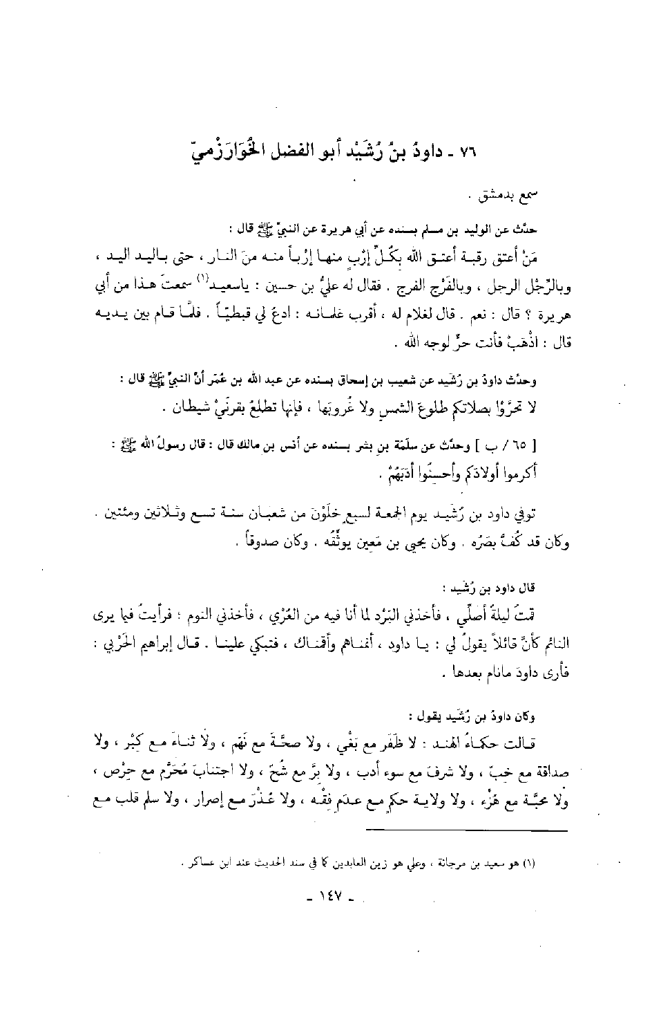 حدث عن الوليد بن مسلم بسنده عن أبي هريرة عن النبي صَلَّى اللهُ عَلَيْهِ وَسَلَّمَ قال: " من أعتق رقبة أعتق الله بكل إرب منها إرباً منه من النار، حتى باليد اليد، وبالرجل الرجل، وبالفرج الفرج. فقال له علي بن حسين: يا سعيد سمعت هذا من أبي هريرة؟ قال: نعم. قال الغلام له، أقرب غلمانه: ادع لي قبطياً. فلما قام بين يديه قال: اذهب فأنت حر لوجه الله ".
