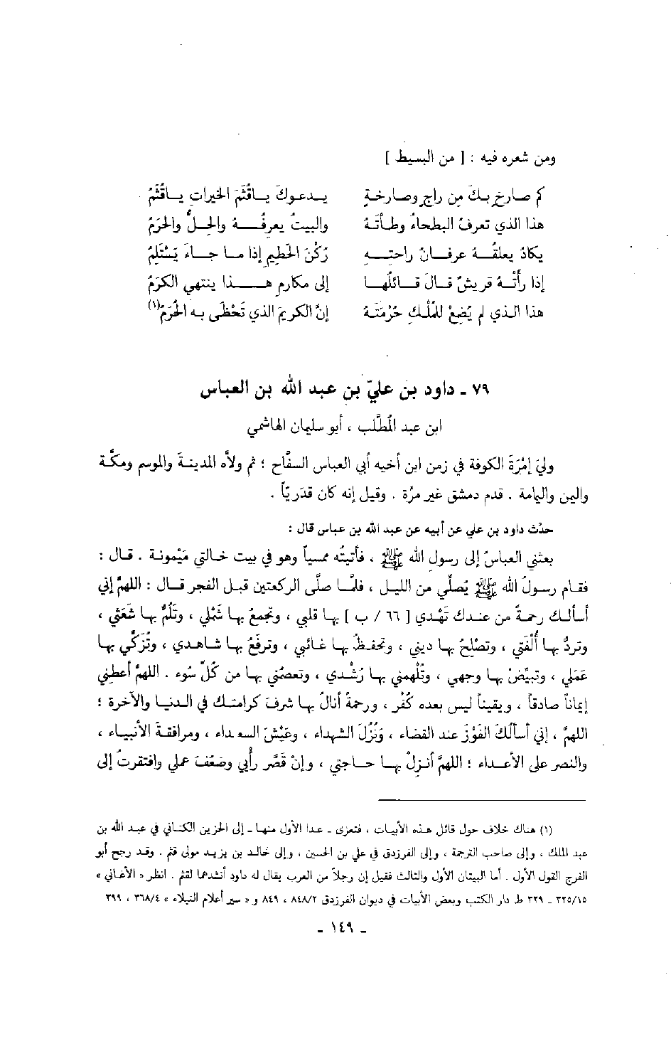 حدث داود بن علي عن أبيه عن عبد الله بن عباس قال: بعثني العباس إلى رسول الله صَلَّى اللهُ عَلَيْهِ وَسَلَّمَ، فأتيته ممسياً وهو في بيت خالتي ميمونة. قال: فقام رسول الله صَلَّى اللهُ عَلَيْهِ وَسَلَّمَ يصلي من الليل، فلما صلى الركعتين قبل الفجر قال: اللهم إني أسألك رحمةً من عندك تهدي بها قلبي، وتجمع بها شملي، وتلم بها شعثي، وترد بها ألفتي، وتصلح بها ديني، وتحفظ بها غائبي، وترفع بها شاهدي، وتزكي بها عملي، وتبيض بها وجهي، وتلهمني بها رشدي، وتعصمني بها من كل سوء. اللهم أعطني إيماناً صادقاً، ويقيناً ليس بعده كفر، ورحمة أنال بها شرف كرامتك في الدنيا والآخرة؛ اللهم، إني أسألك الفوز عند القضاء، ونزل الشهداء، وعيش السعداء، ومرافقة الأنبياء، والنصر على الأعداء؛ اللهم أنزل بها حاجتي، وإن قصر رأيي وضعف عملي وافتقرت إلى
