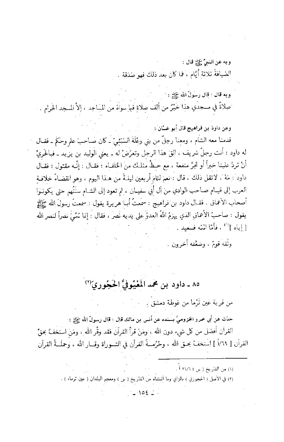 حدث عن أبي عمرو المخزومي بسنده عن أنس بن مالك قال: قال رسول الله صَلَّى اللهُ عَلَيْهِ وَسَلَّمَ: " القرآن أفضل من كل شيء دون الله، ومن قرأ القرآن فقد وقر الله، ومن استخف بحق القرآن استخف بحق الله، وحرمة القرآن في التوراة وقار الله، وحملة القرآن