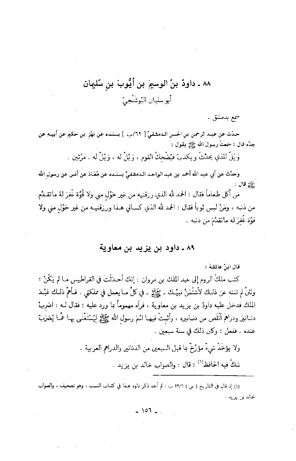 حدث عن عبد الرحمن بن الحسن الدمشقي بسنده عن بعز بن حكيم عن أبيه عن جده قال: سمعت رسول الله صَلَّى اللهُ عَلَيْهِ وَسَلَّمَ يقول: " ويل للذي يحدث ويذب فيضحك القوم، ويل له، ويل له، مرتين ".