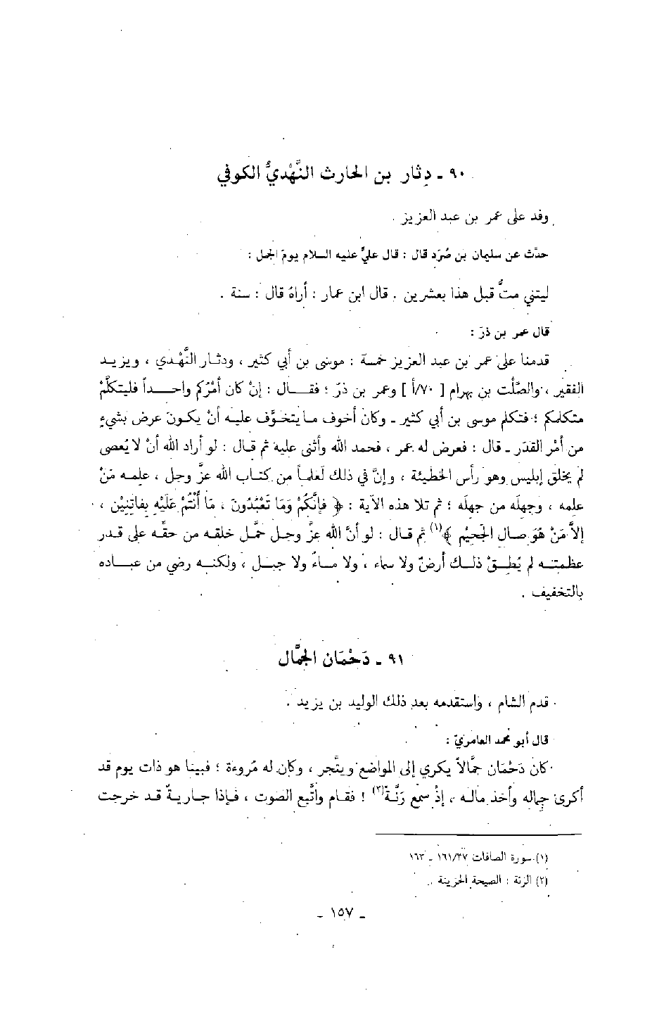 قال عمر بن ذر: قدمنا على عمر بن عبد العزيز خمسة: موسى بن أبي كثير، ودثار النهدي، ويزيد الفقير، والصلت بن بهرام، وعمر بن ذر؛ فقال: إن كان أمركم واحداً فليتكلم متكلمكم؛ فتكلم موسى بن أبي كثير وكان أخوف ما يتخوف عليه أن يكون عرض بشيء من أمر القدر قال: فعرض له عمر، فحمد الله وأثنى عليه ثم قال: لو أراد الله أن لا يعصى لم يخلق إبليس وهو رأس الخطيئة، وإن في ذلك لعلماً من كتاب الله عز وجل، علمه من علمه، وجهله من جهله؛ ثم تلا هذه الآية: " فإنكم وما تعبدون، ما أنتم عليه بفاتنين، إلا من هو صال الجحيم " ثم قال: لو أن الله عز وجل حمل خلقه من حقه على قدر عظمته لم يطق ذلك أرض ولا سماء، ولا ماء ولا جبل، ولكنه رضي من عباده بالتخفيف.