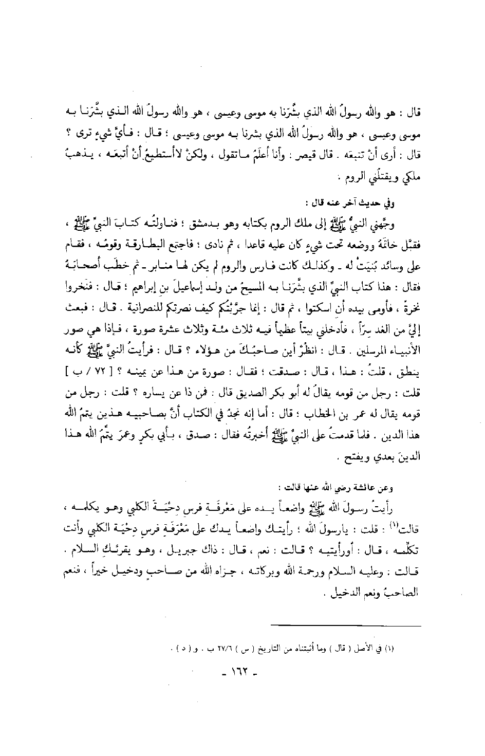 وعن عائشة رضي الله عنها قالت: رأيت رسول الله صَلَّى اللهُ عَلَيْهِ وَسَلَّمَ واضعاً يده على معرفة فرس دحية الكلبي وهو يكلمه، قالت: قلت: يا رسول الله؛ رأيتك واضعاً يدك على معرفة فرس دحية الكلبي وأنت تكلمه، قال: أو رأيتيه؟ قالت: نعم، قال: ذاك جبريل، وهو يقرئك السلام. قالت: وعليه السلام ورحمة الله وبركاته، جزاه الله من صاحب ودخيل حيراً، فنعم الصاحب ونعم الدخيل.