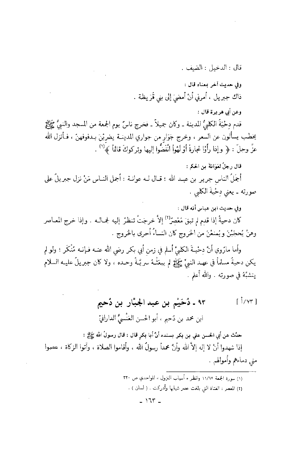 قال رجل لعوانة بن الحكم: أجمل الناس جرير بن عبد الله؛ قال له عوانة: أجمل الناس من نزل جبريل على صورته يعني دحية الكلبي.