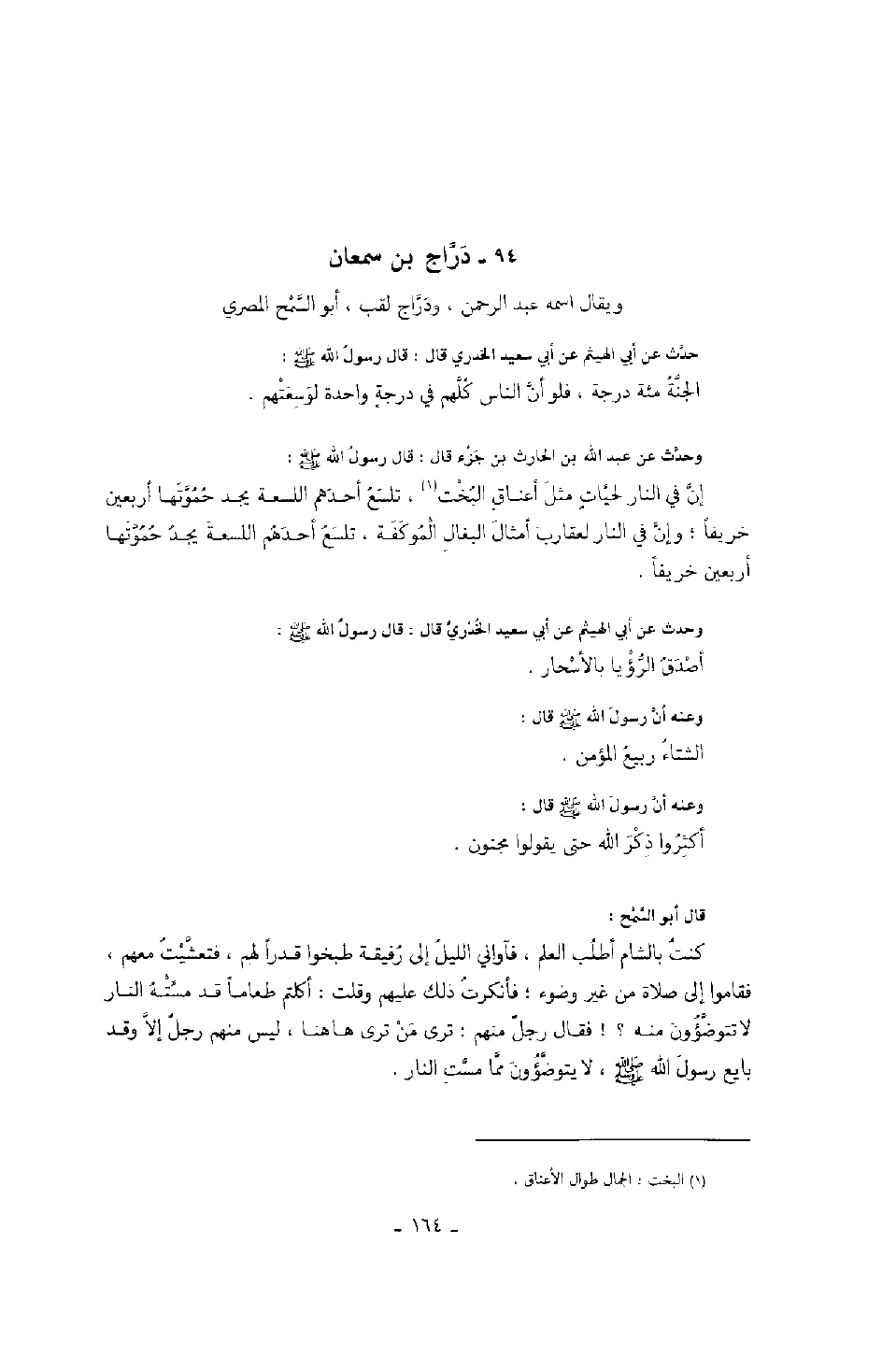 ويقال اسمه عبد الرحمن، ودراج لقب، أبو السمح المصري حدث عن أبي الهيثم عن أبي سعيد الخدري قال: قال رسول الله صَلَّى اللهُ عَلَيْهِ وَسَلَّمَ: " الجنة مئة درجة، فلو أن الناس كلهم في درجة واحدة لوسعتهم ".