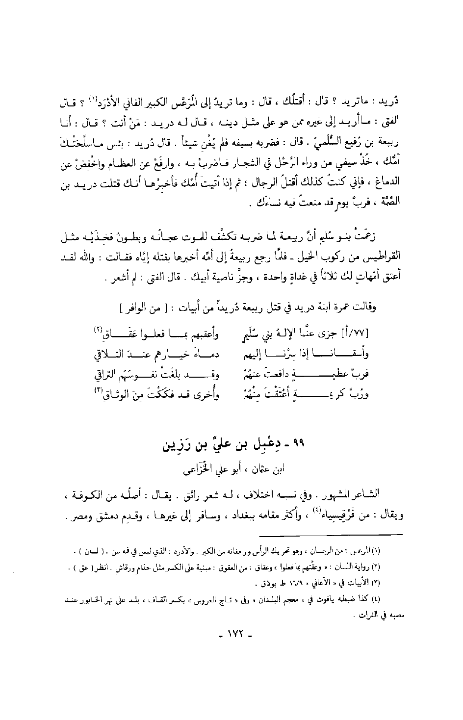 دريد: ما تريد؟ قال: أقتلك، قال: وما تريد إلى المرعس الكبير الفاني الأدرد؟ قال الفتى: ما أريد إلى غيره ممن هو على مثل دينه، قال له دريد: من أنت؟ قال: أنا ربيعة بن رفيع السلمي. قال: فضربه بسيفه فلم يغن شيئاً. قال دريد: بئس ما سلحتك أمك، خذ سيفي من وراء الرحل في لاشجار فاضرب به، وارفع عن العظام واخفض عن الدماغ، فإني كنت كذلك أقتل الرجال؛ ثم إذا أتيت أمك فأخبرها أنك قتلت دريد بن الصمة، فرب يوم قد منعت فيه نساءك.