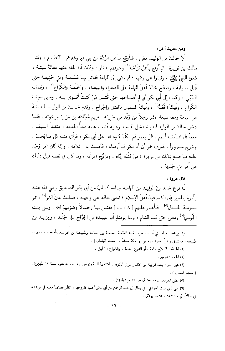 ومن حديث آخر: أن خالد بن الوليد مضى، فأوقع بأهل الردة من بني تميم وغيرهم بالبطاح، وقتل مالك بن نويرة، ثم أوقع بأهل بزاخة وحرقهم بالنار، وذلك أنه بلغه عنهم مقالة سيئة، شتموا النبي صَلَّى اللهُ عَلَيْهِ وَسَلَّمَ، وثبتوا على ردتهم؛ ثم مضى إلى اليمامة فقاتل بها مسيلمة وبني حنيفة حتى قتل مسيلمة، وصالح خالد أهل اليمامة على الصفراء والبيضاء، والحلقة والكراع، ونصف السبي؛ وكتب إلى أبي بكر أني لم أصالحهم حتى قتل من كنت أقوى به، وحتى عجف الكراع، ونهك الخف، ونهك المسلمون بالقتل والجراح. وقدم خالد بن الوليد المدينة من اليمامة ومعه سبعة عشر رجلاً من وفد بني حنيفة، فيهم مجاعة بن مرارة وإخوته. فلما دخل خالد بن الوليد المدينة دخل المسجد وعليه قباء، عليه صدأ الحديد، متقلدا السيف، معتماً في عمامته أسهم، فمر بعمر فلم يكلمه ودخل على أبي بكر، فرأى منه كل ما يحب، وخرج مسروراً، فعرف عمر أن أبا بكر قد أرضاه، فأمسك عن كلامه. وإنما كان عمر وجد عليه فيما صنع بمالك بن نويرة؛ من قتله إياه، وتزوج امرأته، وما كان في نفسه قبل ذلك من أمر بني جذيمة.