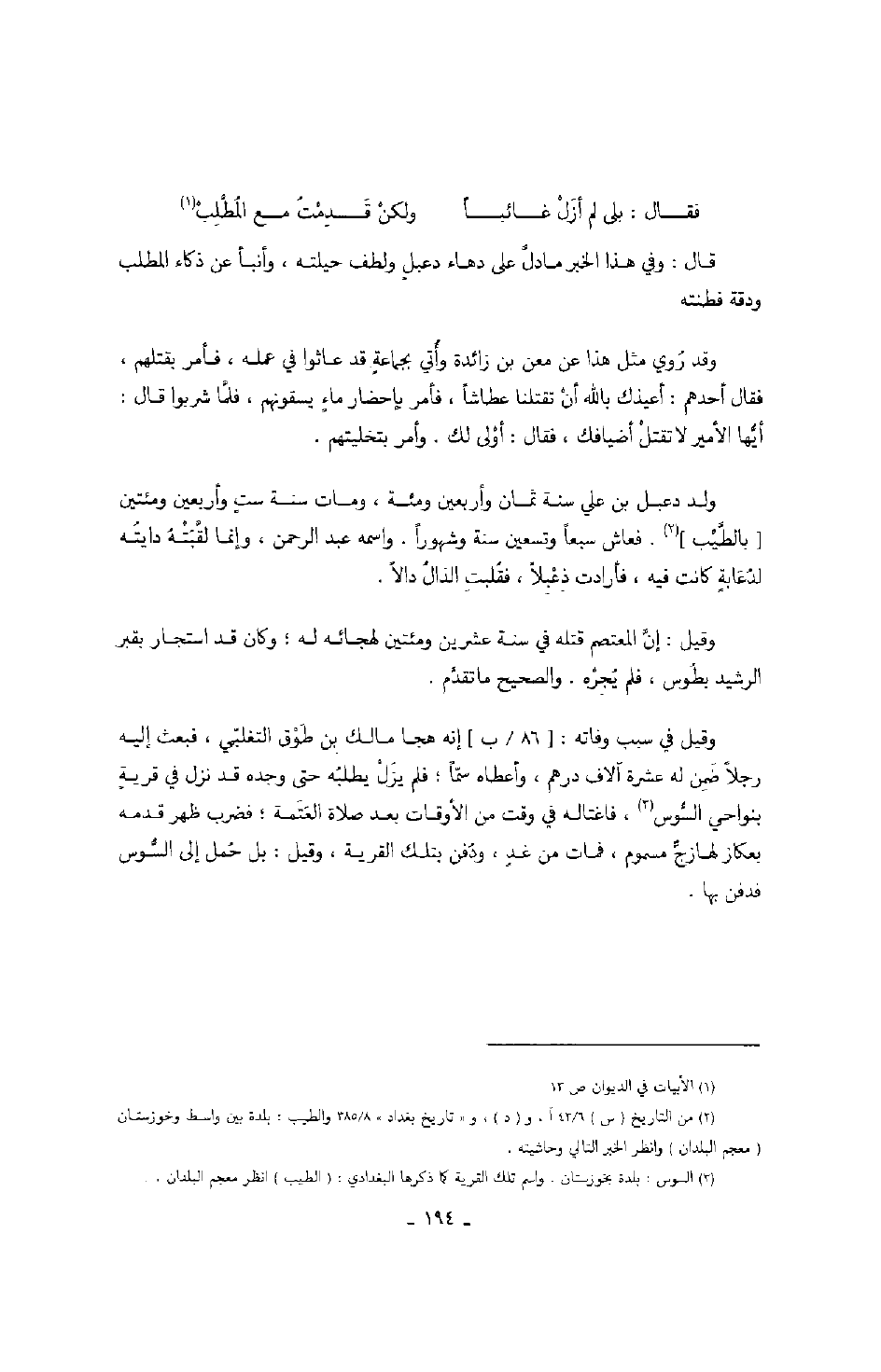 وقيل: إن المعتصم قتله في سنة عشرين ومئتين لهجائه له؛ وكان قد استجار بقبر الرشيد بطوس، فلم يجره. والصحيح ما تقدم.