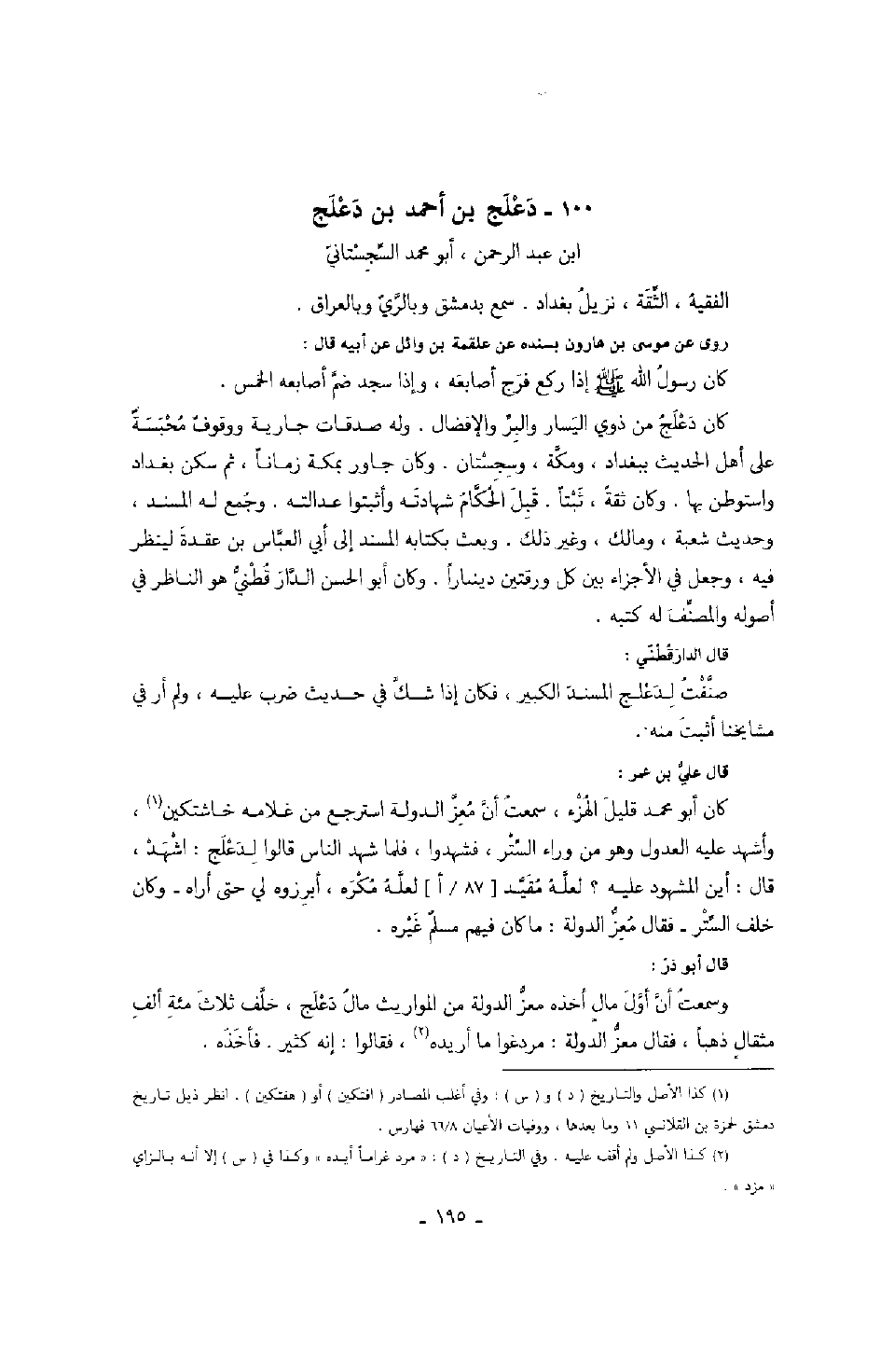 قال الدارقطني: صنفت لدعلج المسند الكبير، فكان إذا شك في حديث ضرب عليه، ولم أر في مشايخنا أثبت منه.
