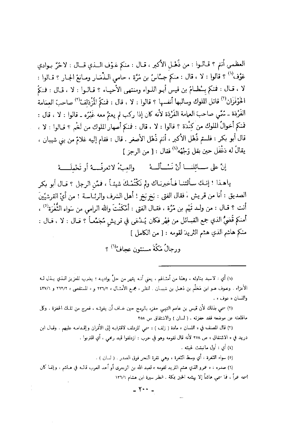 يا هذا! إنك سألتنا فأخبرناك ولم نكتمك شيئاً، فممن الرجل؟ قال أبو بكر الصديق: أنا من قريش، فقال الفتى: بخ بخ! أهل الشرف والرئاسة! من أي القرشيين أنت؟ قال: من ولد تيم بن مرة، فقال الفتى: أمكنت والله الرامي من سواء الثغرة، امنكم قصي الذي جمع القبائل من فهر فكان يدعى في قريش مجمعاً؟ قال: لا، قال: منكم هاشم الذي هشم الثريد لقومه: