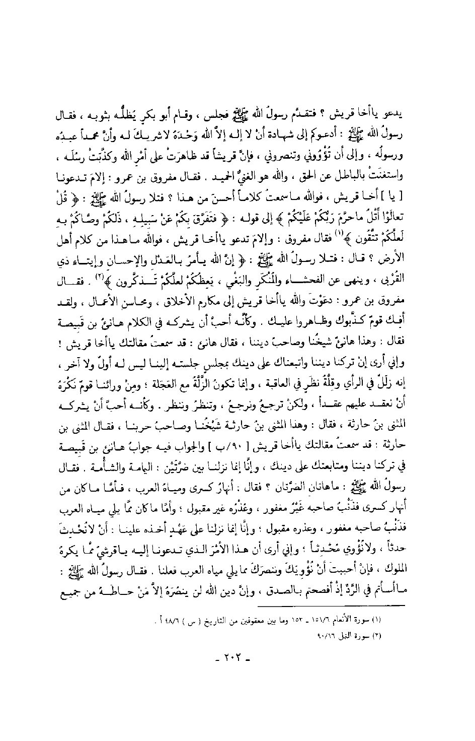 يدعو يا أخا قريش؟ فتقدم رسول الله صَلَّى اللهُ عَلَيْهِ وَسَلَّمَ فجلس، وقام أبو بكر يظله بثوبه، فقال رسول الله صَلَّى اللهُ عَلَيْهِ وَسَلَّمَ: أدعوكم إلى شهادة أن لا إله إلا الله وحده لا شريك له وأن محمداً عبده ورسوله، وإلى أن تؤووني وتنصروني، فإن قريشاً قد ظاهرت على أمر الله وكذبت رسله، واستغنت بالباطل عن الحق، والله هو الغني الحميد، فقال مفروق بن عمرو: إلام تدعونا يا أخا قريش، فوالله ما سمعت كلاماً أحسن من هذا؟ فتلا رسول الله صَلَّى اللهُ عَلَيْهِ وَسَلَّمَ: " قل تعالوا أتل ما حرم ربكم عليكم " إلى قوله " فتفرق بكم عن سبيله، ذلكم وصاكم به لعلكم تتقون " فقال مفروق: وإلام تدعو يا أخا قريش، فوالله ما هذا من كلام أهل الأرض؟ قال: فتلا رسول الله صَلَّى اللهُ عَلَيْهِ وَسَلَّمَ: " إن الله يأمر بالعدل والإحسان وإيتاء ذي القربى، وينهى عن الفحشاء والمنكر والبغي، يعظكم لعلكم تذكرون ". فقال مفروق بن عمرو: دعوت والله يا أخا قريش إلى مكارم الأخلاق، ومحاسن الأعمال، ولقد أفك قوم كذبوك وظاهروا عليك. وكأنه أحب أن يشركه في الكلام هانئ بن قبيصة فقال: وهذا هانئ شيخنا وصاحب ديننا، فقال هانئ: قد سمعت مقالتك يا أخا قريش! وإني أرى إن تركنا ديننا واتبعناك على دينك بمجلس جلسته لينا ليس له أول ولا آخر، إنه زلل في الرأي وقلة نظر في العاقبة، وإنما تكون الزلة مع العجلة؛ ومن ورائنا قوم نكره أن نعقد عليهم عقداً، ولكن ترجع ونرجع، وتنظر وننظر. وكأنه أحب أن يشركه المثنى بن حارثة، فقال: وهذا المثنى بن حارثة شيخنا وصاحب حربنا، فقال المثنى بن حارثة: قد سمعت مقالتك يا أخا قريش والجواب فيه جواب هانئ بن قبيصة في تركنا ديننا ومتابعتك على دينك، وإنا إنما نزلنا بين ضرتين: اليمامة والشأمة. فقال رسول الله صَلَّى اللهُ عَلَيْهِ وَسَلَّمَ: ما هاتان الضرتان؟ فقال: انهار كسرى ومياه العرب، فأما ما كان من أنهار كسرى فذنب صاحبه غير مغفور، وعذره غير مقبول؛ وأما ما كان مما يلي مياه العرب فذنب صاحبه مغفور، وعذره مقبول؛ وإنا إنما نزلنا على عهد أخذه علينا: أن لا نحدث جدثاً، ولا نؤوي محدثاً؛ وإني أرى أن هذا الأمر الذي تدعونا إليه يا قرشي مما يكره الملوك، فإن أحببت أن نؤويك وننصرك مما يلي مياه العرب فعلنا. فقال رسول الله صَلَّى اللهُ عَلَيْهِ وَسَلَّمَ: ما أسأتم في الرد إذ أفصحتم بالصدق، وإن دين الله لن ينصره إلا من حاطه من جميع