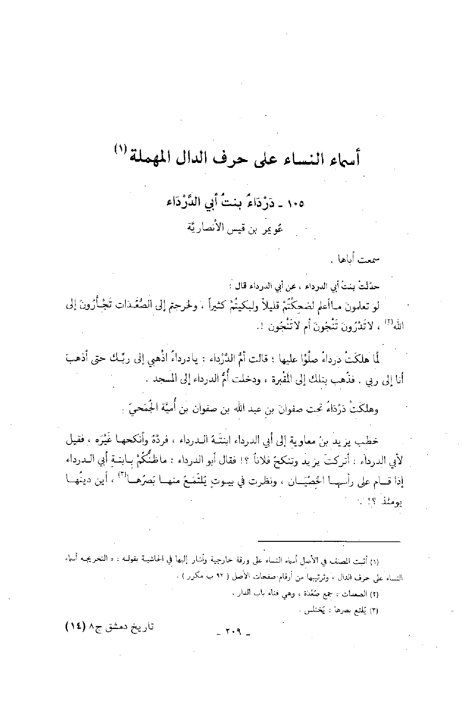لما هلكت درداء صلوا عليها؛ قالت أم الدرداء: يا درداء اذهبي إلى ربك حتى أذهب أنا إلى ربي. فذهب بتلك إلى المقبرة، ودخلت أم الدرداء إلى المسجد.