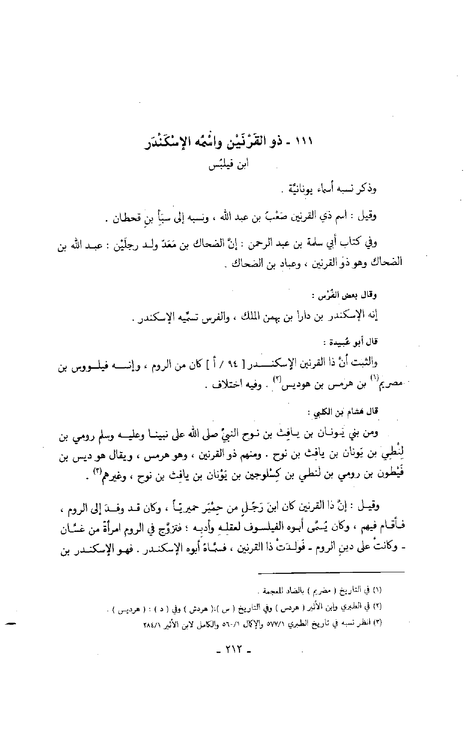 قال أبو عبيدة: والثبت أن ذا القرنين الإسكندر كان من الروم، وإنه فيلووس بن مصريم بن هرمس بن هوديس. وفيه اختلاف.