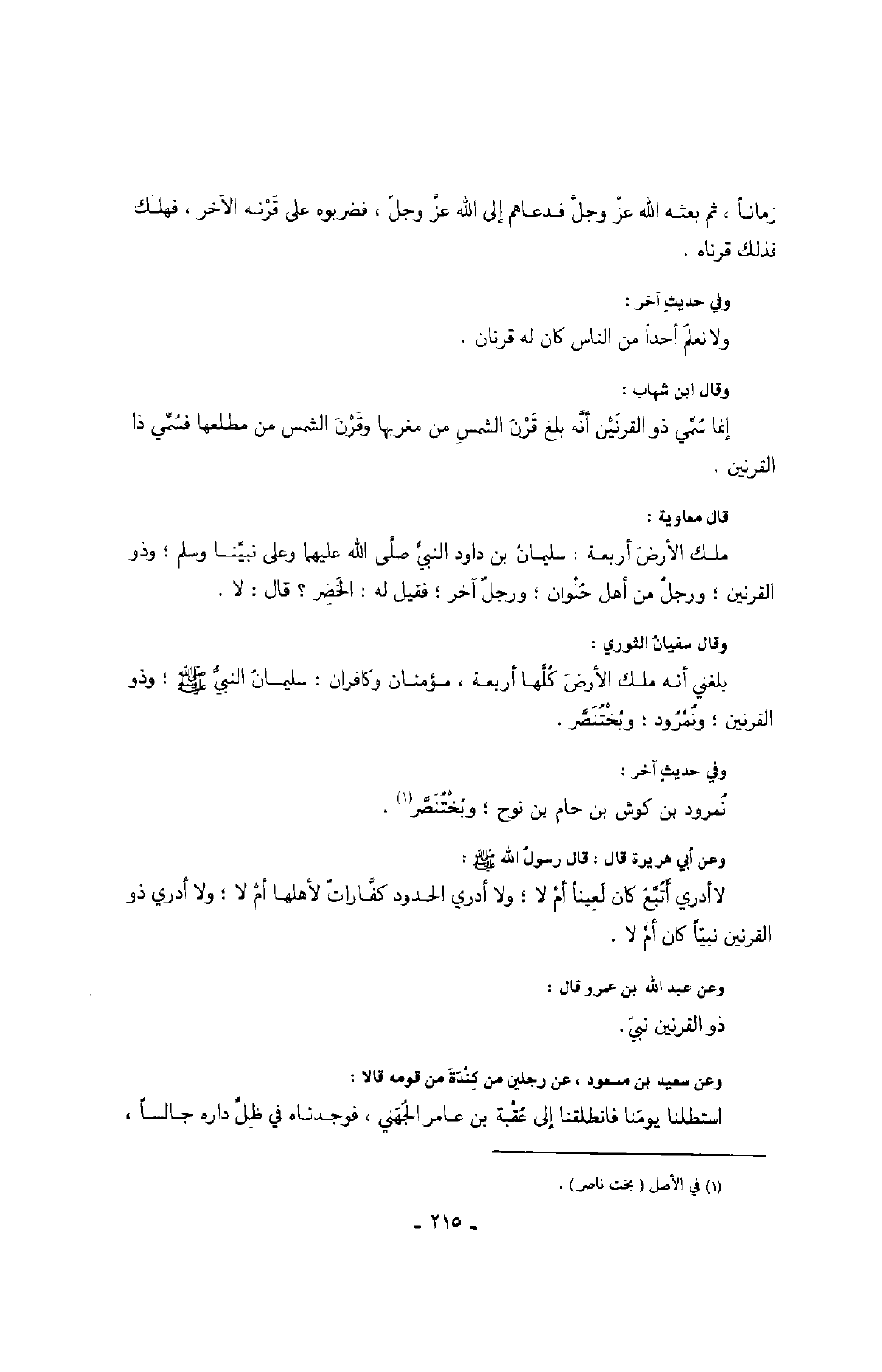 وقال سفيان الثوري: بلغني أنه ملك الأرض كلها أربعة، مؤمنان وكافران: سليمان النبي صَلَّى اللهُ عَلَيْهِ وَسَلَّمَ؛ وذو القرنين؛ ونمرود؛ وبختنصر.