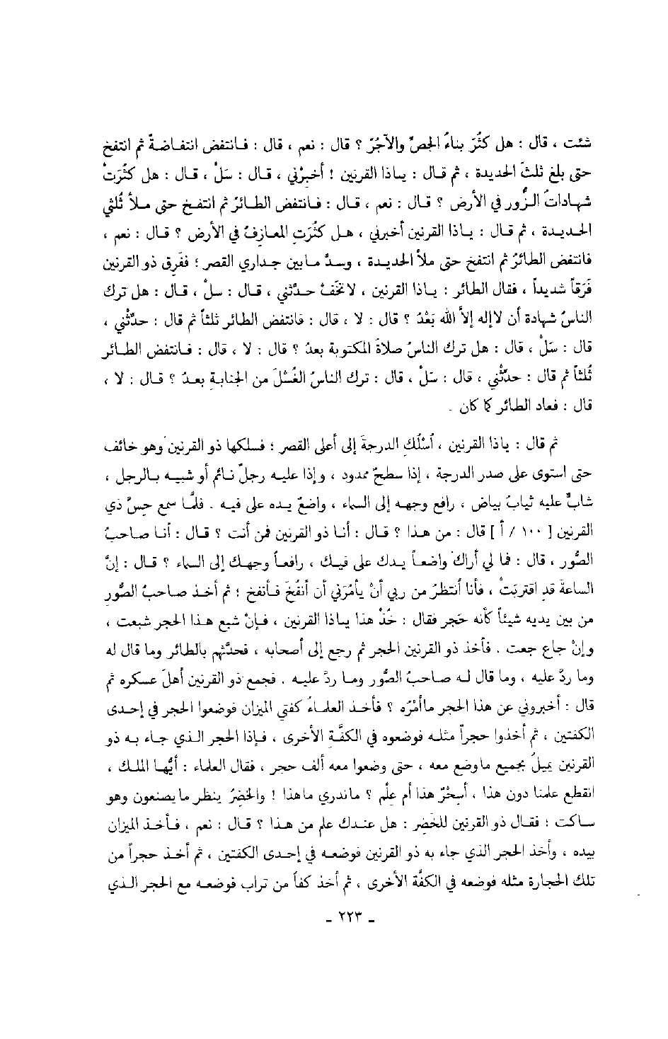 شئت، قال: هل كثر بناء الجص والآجر؟ قال: نعم، قال: فانتفض انتفاضة ثم انتفخ حتى بلغ ثلث الحديدة، ثم قال: يا ذا القرنين! أخبرني، قال: سل، قال: هل كثرت شهادات الزور في الأرض؟ قال: نعم، قال: فانتفض الطائر ثم انتفخ حتى ملأ ثلثي الحديدة، ثم قال: يا ذا القرنين أخبرني، هل كثرت المعازف في الأرض؟ قال: نعم، فانتفض الطائر ثم انتفخ حتى ملأ الحديدة، وسد ما بين جداري القصر؛ ففرق ذو القرينن فرقاً شديداً، فقال الطائر: يا ذا القرنين، لاتخف حدثني، قال: سل، قال: هل ترك الناس شهادة أن لا إله إلا الله بعد؟ قال: لا، قال: فانتفض الطائر ثلثاً ثم قال: حدثني، قال: سل، قال: هل ترك الناس صلاة المكتوبة بعد؟ قال: لا، قال: فانتفض الطائر ثلثاً ثم قال: حدثني، قال: سل، قال: ترك الناس الغسل من الجنابة بعد؟ قال: لا، قال: فعاد الطائر كما كان.