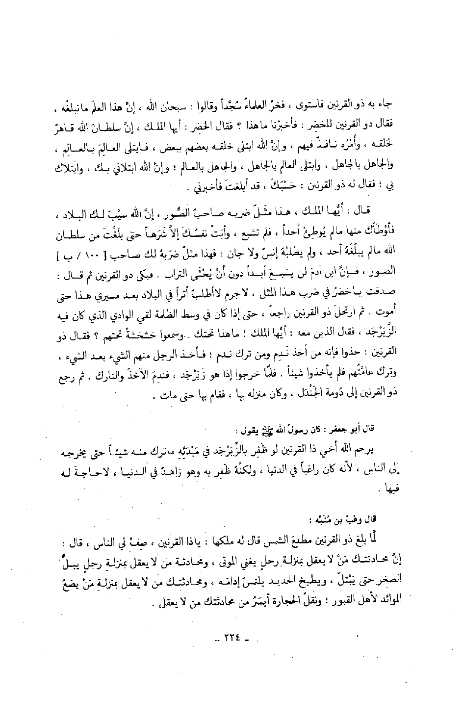 قال أبو جعفر: كان رسول الله صَلَّى اللهُ عَلَيْهِ وَسَلَّمَ يقول: " يرحم الله أخي ذا القرنين لو ظفر بالزبرجد في مبدئه ما ترك منه شيئاً حتى يخرجه إلى الناس، لأنه كان راغباً في الدنيا، ولكنه ظفر به وهو زاهد في الدنيا، لا حاجة له فيها ".