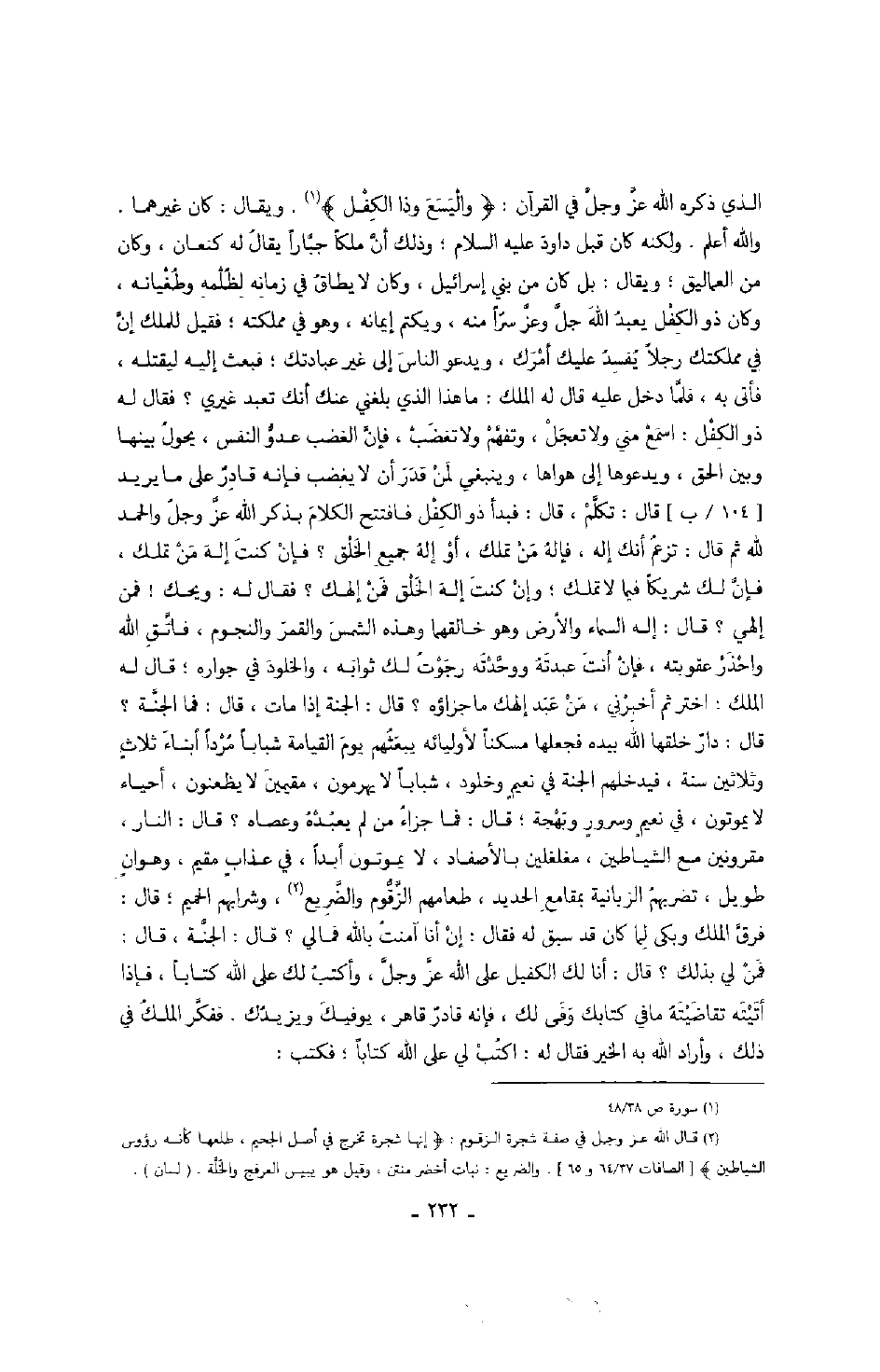 الذي ذكره الله عز وجل في القرآن: " واليسع وذا الكفل ". ويقال: كان غيرهما. والله أعلم. ولكنه كان قبل داود عليه السلام؛ وذلك أن ملكاً جباراً يقال له كنعان، وكان من العماليق؛ ويقال: بل كان من بني إسرائيل، وكان لا يطاق في زمانه لظلمه وطغيانه، وكان ذو الكفل يعبد الله جل وعز سراً منه، ويكتم إيمانه، وهو في مملكته؛ فقيل للملك إن في مملكتك رجلاً يفسد عليك أمرك، ويدعو الناس إلى غير عبادتك؛ فبعث إليه ليقتله، فأتى به، فلما دخل عليه قال له الملك: ما هذا الذي بلغني عنك أنك تعبد غيري؟ فقال له ذو الكفل: اسمع مني ولا تعجل، وتفهم ولا تغضب، فإن الغضب عدو النفس، يحول بينها وبين الحق، ويدعوها إلى هواها، وينبغي لمن قدر أن لا يغضب فإنه قادر على ما يريد، قال: تكلم، قال: فبدأ ذو الكفل فافتتح الكلام بذكر الله عز وجل والحمد لله ثم قال: تزعم أنك إله، فإله من تملك، أو إله جميع الخلق؟ فإن كنت إله من تملك، فإن لك شريكاً فيما لا تملك؛ وإن كنت إله الخلق فمن إلهك؟ فقال له: ويحك! فمن إلهي؟ قال: إله السماء والأرض وهو خالقهما وهذه الشمس والقمر والنجوم، فاتق الله واحذر عقوبته، فإن أنت عبدته ووحدته رجوت لك ثوابه، والخلود في جواره؛ قال له الملك: اختر ثم أخبرني، من عبد إلهك ما جزاؤه؟ قال: الجنة إذا مات، قال: فما الجنة؟ قال: دار خلقها الله بيده فجعلها مسكناً لأوليائه يبعثهم يوم القيامة شباباً مرداً أبناء ثلاث وثلاثين سنة، فيدخلهم الجنة في نعيم وخلود، شباباً لا يهرمون، مقيمين لا يظعنون، أحياء لا يموتون، ونعيم وسرور وبهجة؛ قال: فما جزاء من لم يعبده وعصاه؟ قال: النار، مقرونين مع الشياطين، مغلغلين بالأصفاد، لا يموتون أبداً، في عذاب مقيم، وهوان طويل، تضربهم الزبانية بمقامع الحديد، طعامهم الزقوم والضريع، وشرابهم الحميم؛ قال: فرق الملك وبكى لما كان قد سبق له فقال: إن أنا آمنت بالله فمالي؟ قال: الجنة، قال: فمن لي بذلك؟ قال: أنا لك الكفيل على الله عز وجل، وأكتب لك على الله كتاباً، فإذا أتيته تقاضيته ما في كتابك وفى لك، فإنه قادر ماهر، يوفيك ويزيدك. ففكر الملك في ذلك، وأراد الله به الخير فقال له: اكتب لي على الله كتاباً؛ فكتب: "