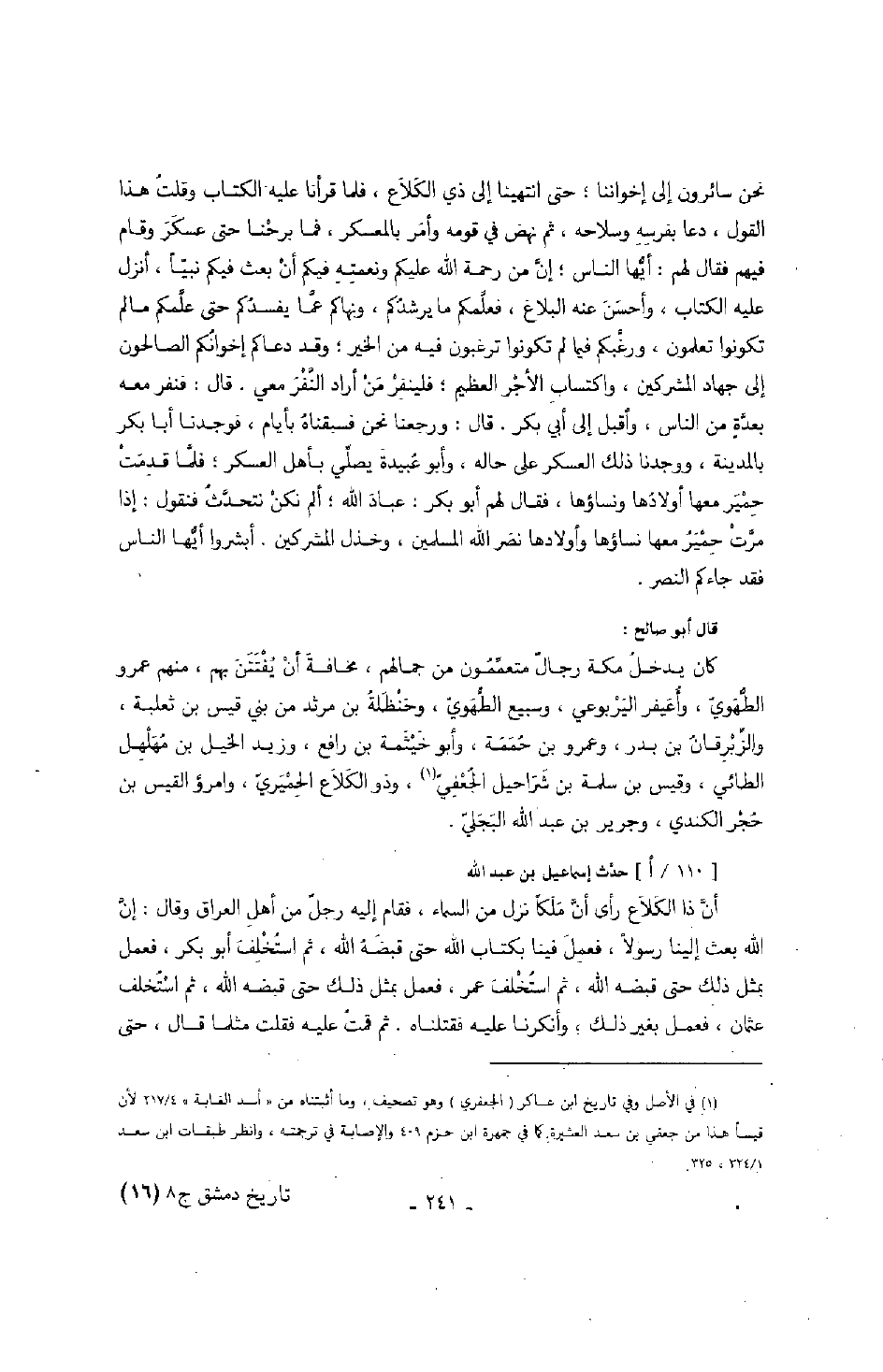 نحن سائرون إلى إخواننا؛ حتى انتهينا إلى ذي الكلاع، فلما قرأنا عليه الكتاب وقلت هذا القول، دعا بفرسه وسلاحه، ثم نهض في قومه وأمر بالمعسكر، فما برحنا حتى عسكر وقام فيهم فقال لهم: أيها الناس؛ إن من رحمة الله عليكم ونعمته فيكم أن بعث فيكم نبياً، أنزل عليه الكتاب، وأحسن عنه البلاغ، فعلمكم ما يرشدكم، ونهاكم عما يفسدكم حتى علمكم ما لم تكونوا تعلمون، ورغبكم فيما لم تكونوا ترغبون فيه من الخير؛ وقد دعاكم إخوانكم الصالحون إلى جهاد المشركين، واكتساب الأجر العظيم؛ فلينفر من أراد النفر معي. قال: فنفر معه بعدة من الناس، وأقبل إلى أبي بكر. قال: ورجعنا نحن فسبقناه بأيام، فوجدنا أبا بكر بالمدينة، ووجدنا ذلك العسكر على حاله، وأبو عبيدة يصلي بأهل العسكر؛ فلما قدمت حمير معها أولادها ونساؤها، فقال لهم أبو بكر: عباد الله؛ ألم نكن نتحدث فنقول: إذا مرت حمير معها نساؤها وأولادها نصر الله المسلمين، وخذل المشركين. أبشروا أيها الناس فقد جاءكم النصر.