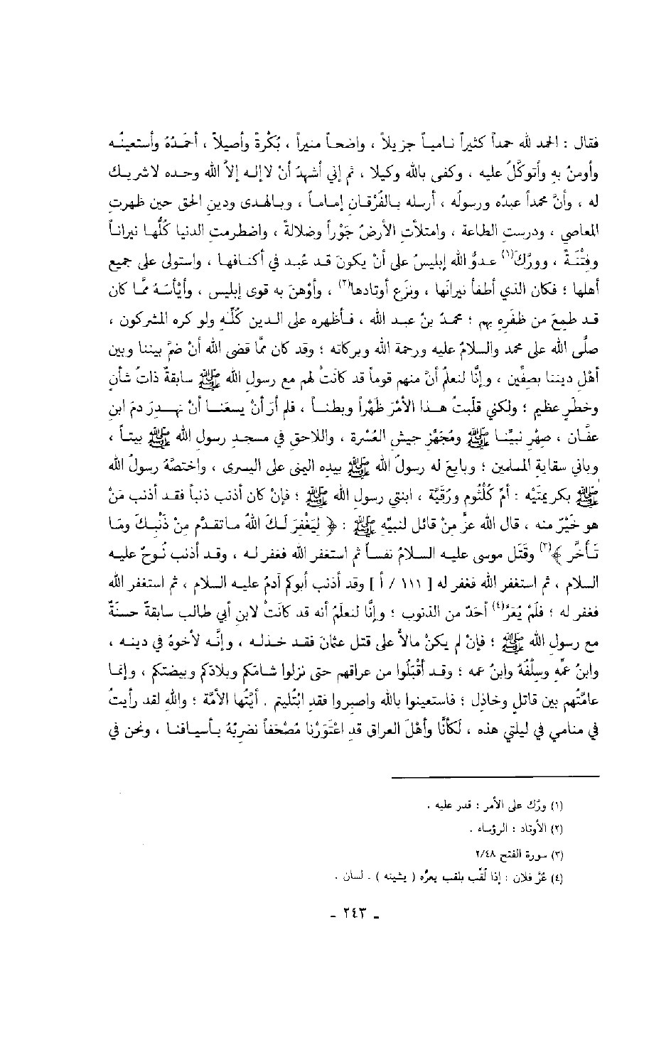 فقال: الحمد لله كثيراً نامياً جزيلاً، واضحاً منيراً، بكرةً وأصيلاً، أحمده على قتال علي ومن معه من أهل العراق فقعد على فرسه وكان من أعظم أصحاب معاوية وأستعينه وأومن به وأتوكل عليه، وكفى بالله وكيلا، ثم إني أشهد أن لا إله إلا الله وحده لا شريك له، وأن محمداً عبده ورسوله، أرسله بالفرقان إماماً، وبالهدى ودين الحق حين ظهرت المعاصي، ودرست الطاعة، وامتلأت الأرض جوراً وضلالةً، واضطرمت الدنيا كلها نيرانا وفتنةً، وورك عدو الله إبليس على أن يكون قد عبد في أكنافها، واستولى على جميع اهلها؛ فكان الذي أطفأ نيرانها، ونزع أوتادها، وأوهن به قوى إبليس، وأيأسه مما كان قد طمع من ظفره بهم؛ محمد بن عبد الله، فأظهره على الدين كله ولو كره المشركون، صلى الله على محمد والسلام عليه ورحمة الله وبركاته؛ وقد كان مما قضى الله أن ضم بيننا وبين أهل ديننا بصفين، وإنا لنعلم أن منهم قوماً قد كانت لهم مع رسول الله صَلَّى اللهُ عَلَيْهِ وَسَلَّمَ سابقة ذات شأن وخطر عظيم؛ ولكني قلبت هذا الأمر ظهراً وبطناً، فلم أر أن يسعنا أن نهدر دم ابن عفان، صهر نبينا صَلَّى اللهُ عَلَيْهِ وَسَلَّمَ ومجهز جيش العسرة، واللاحق في مسجد رسول الله صَلَّى اللهُ عَلَيْهِ وَسَلَّمَ بيتاً، وباني سقاية المسلمين؛ وبايع له رسول الله صَلَّى اللهُ عَلَيْهِ وَسَلَّمَ بيده اليمنى على اليسرى، واختصه رسول الله صَلَّى اللهُ عَلَيْهِ وَسَلَّمَ بكريمتيه: أم كلثوم ورقية، ابنتي رسول الله صَلَّى اللهُ عَلَيْهِ وَسَلَّمَ؛ فإن كان أذنب ذنباً فقد أذنب من هو خير منه، قال الله عز من قائل لنبيه صَلَّى اللهُ عَلَيْهِ وَسَلَّمَ: " ليغفر لك الله ما تقدم من ذنبك وما تأخر " وقتل موسى عليه السلام نفساً ثم استغفر الله فغفر له، وقد أذنب نوح عليه السلام، ثم استغفر الله فغفر له، وقد أذنب أبوكم آدم عليه السلام، ثم استغفر الله فغفر له؛ فلم يعر أحد من الذنوب؛ وإنا لنعلم أنه قد كانت لابن أبي طالب سابقة حسنة مع رسول الله صَلَّى اللهُ عَلَيْهِ وَسَلَّمَ؛ فإن لم يكن مالأ على قتل عثمان فقد خذله، وإنه لأخوه في دينه، وابن عمه وسلفه وابن عمه؛ وقد أقبلوا من عراقهم حتى نزلوا شامكم وبلادكم وبيضتكم، وإنما عامتهم بين قاتل وخاذل؛ فاستعينوا بالله واصبروا فقد ابتليتم. أيتها الأمة؛ والله لقد رأيت في منامي في ليلتي هذه، لكأنا وأهل العراق قد اعتورنا مصحفاً نضربه بأسيافنا، ونحن في