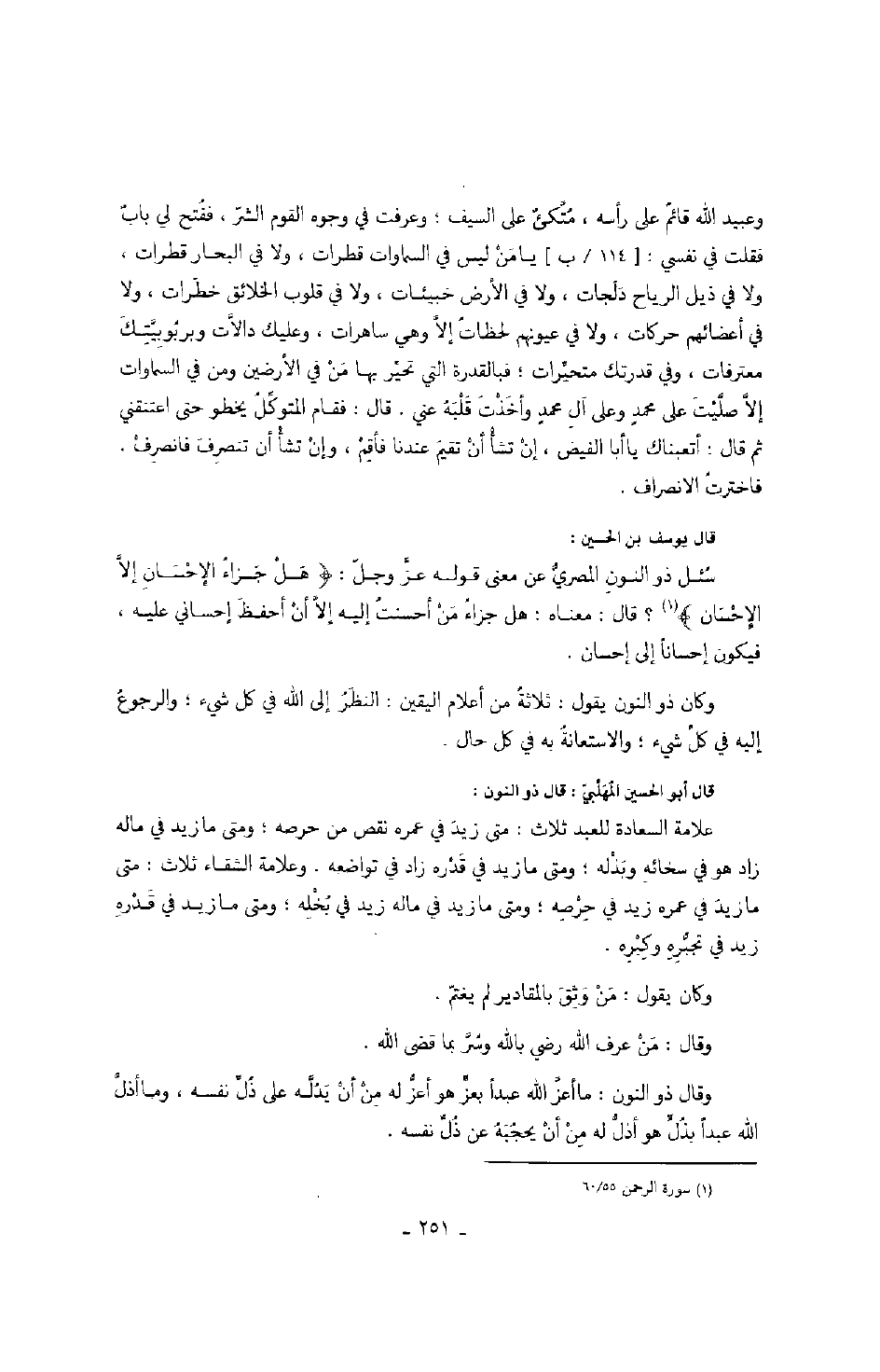 قال يوسف بن الحسين: سئل ذو النون المصري عن معنى قوله عز وجل: " هل جزاء الإحسان إلا الإحسان "؟ قال: معناه: هل جزاء من أحسنت إليه إلا أن أحفظ إحساني عليه، فيكون إحساناً إلى إحسان.