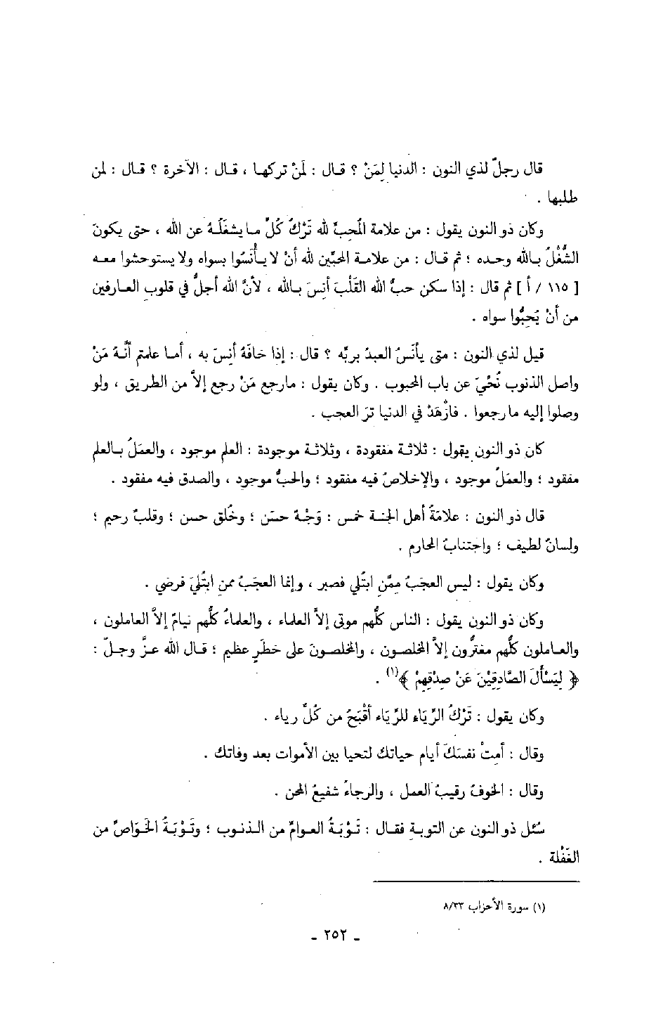 قال رجل لذي النون: الدنيا لمن؟ قال: لمن تركها، قال الآخرة؟ قال: لمن طلبها. وكان ذو النون يقول: من علامة المحب لله ترك كل ما يشغله عن الله، حتى يكون الشغل بالله وحده؛ ثم قال: من علامة المحبين لله أن لا يأتوا بسواه ولا يستوحشوا معه، ثم قال: إذا سكن حب الله القلب أنس بالله، لأن الله أجل في قلوب العارفين من أن يحبوا سواه.